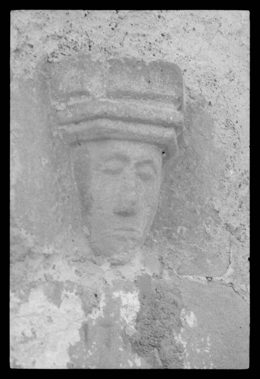 photographie, MNATP. Chantier 1425. Enquête sur l'architecture rurale de la France (1941-1946), Porte de la façade principale de la maison de Monsieur Loustouneau avec une sculpture vue en plan rapprochée
