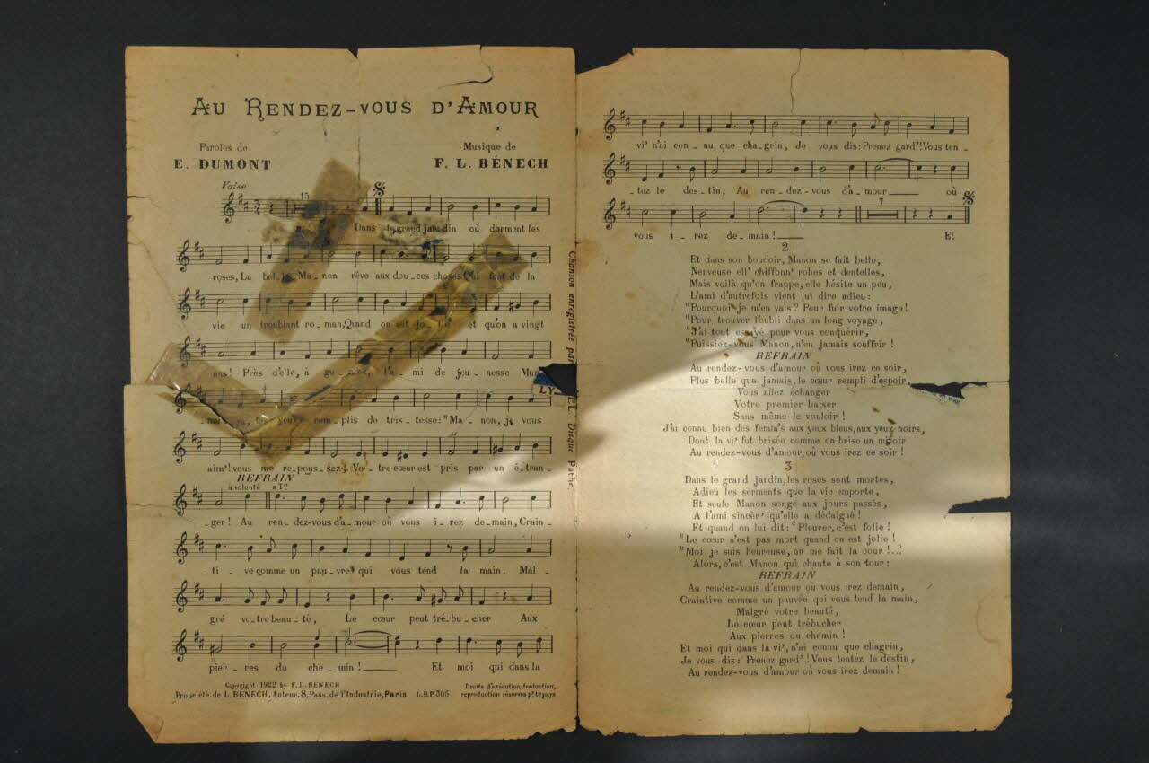 Des inscriptions renseignent le titre, les auteurs, les exécutants et l'éditeur. A l'intérieur, partition et paroles de la chanson. Au dos, liste d'autres partitions publiées par l'éditeur.Matériaux et techniques