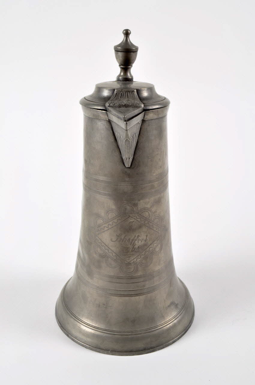 Circulaire à bords hauts rétrécis. A l'avant, un bec verseur présentant des décors de feuilles. A l'arrière, une anse plate. Dessus, un couvercle mobile à bouton de préhension en forme de vase. En bas, un large pied galbé. Sur la panse entre deux séries de lignes gravées et un cartouche en forme de losange avec feston et dents-de-scie, inscrit : " g. Schaffert 65"Inscriptions