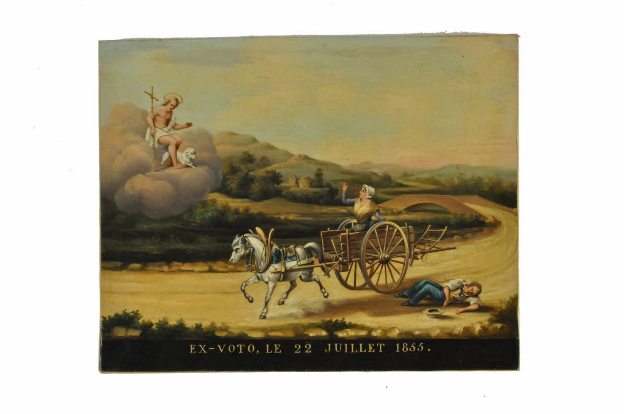 L'ex-voto représente une scène miraculeuse. Dans un paysage de campagne une femme est assise dans un charette et regarde vers Saint Jean-Bastiste, on le reconnait grâce à l'agneau blanc. Un homme en pantalon bleu est représenté allongé dans le coin inférieur droit. Une bande noire figure sur la partie inférieure.Décor