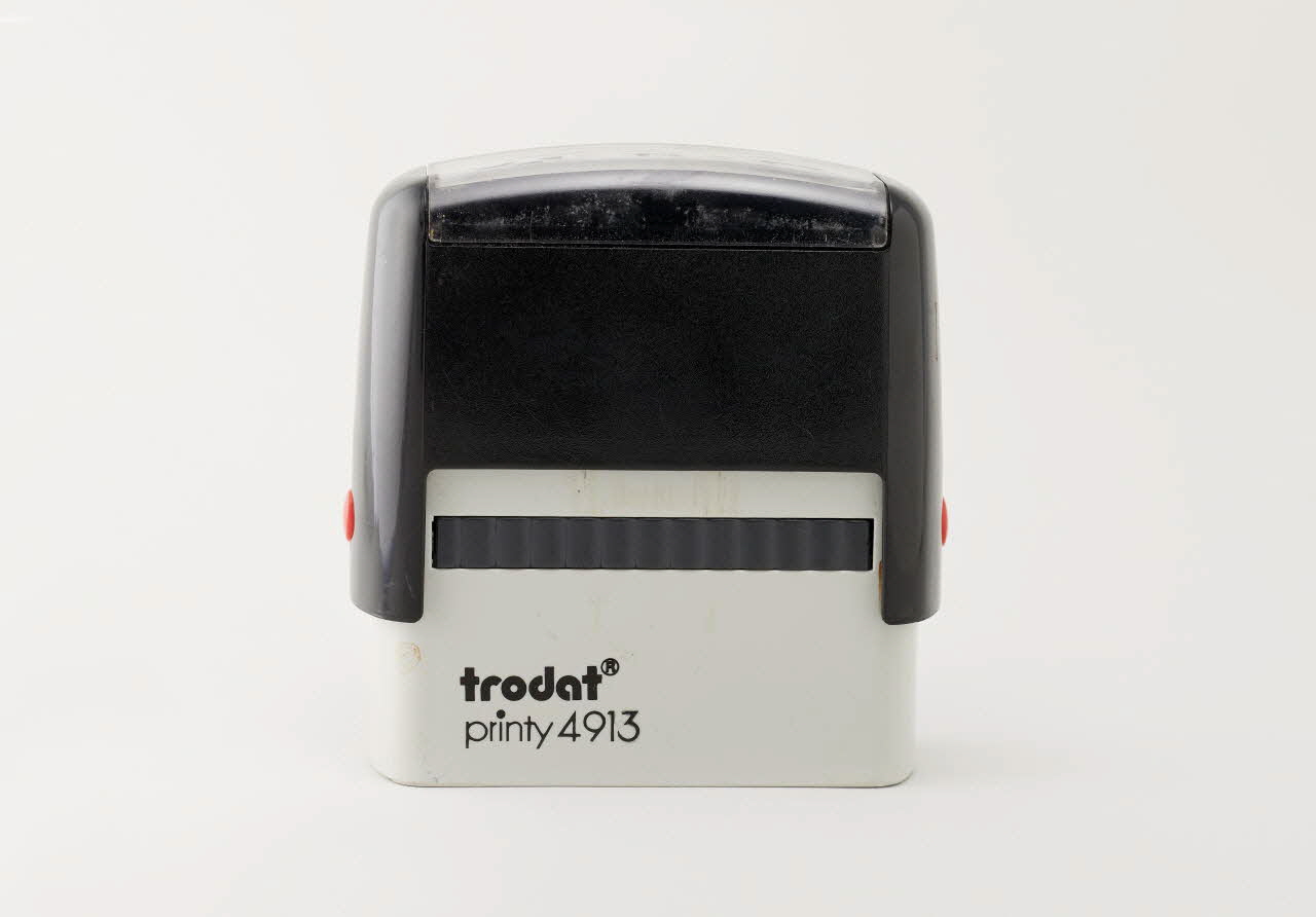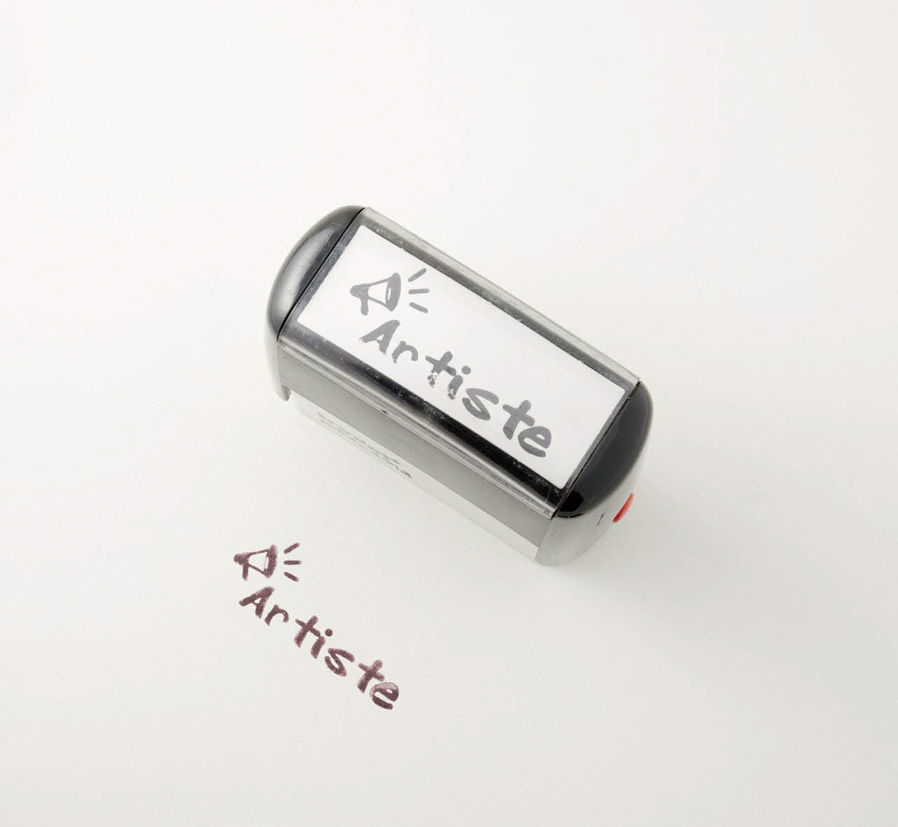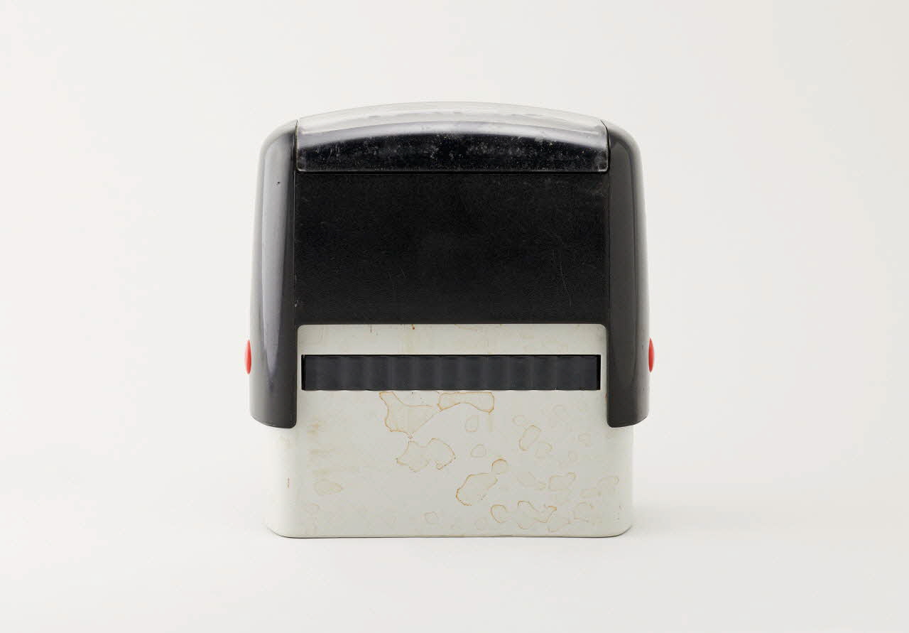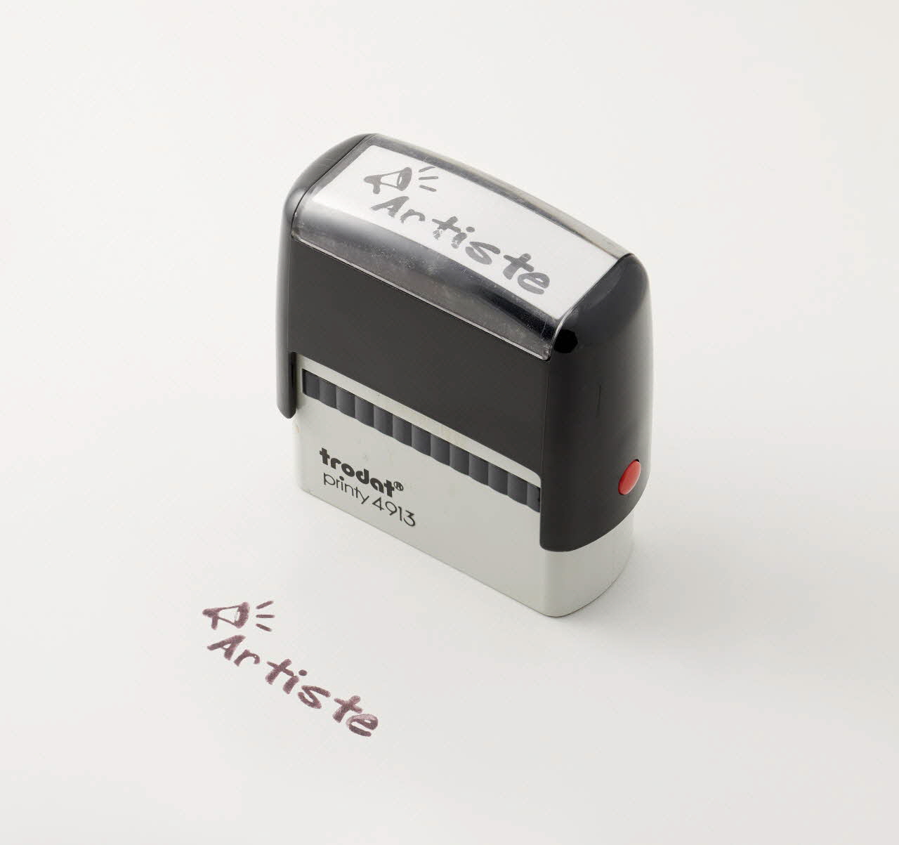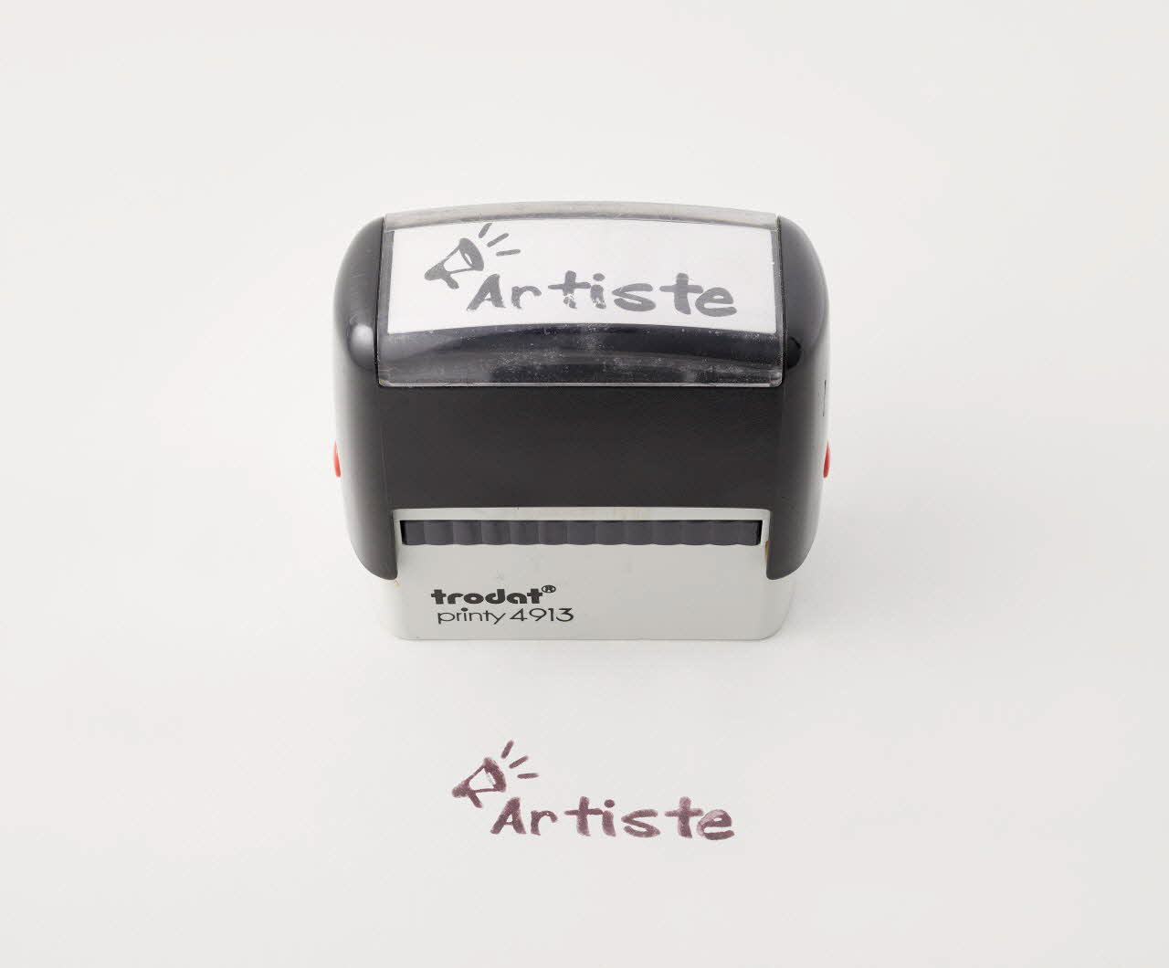 Tampon encreur de bureau, corps compact parallélépipédique en plastique rigide moulé gris noir, et muni de boutons latéraux rouges, de type automatique (modèle trodat printy 4913), qui se compose d'un mécanisme interne permettant le ré encrage du cachet à chaque coup de tampon, pour plus de rapidité. Ce tampon permet d'imprimer l'inscription "Artiste" en lettres minuscules sauf l'initiale, grasses et devancées par un dessin de porte-voix dont le volume est suggéré par trois traits rayonnants.Inscriptions