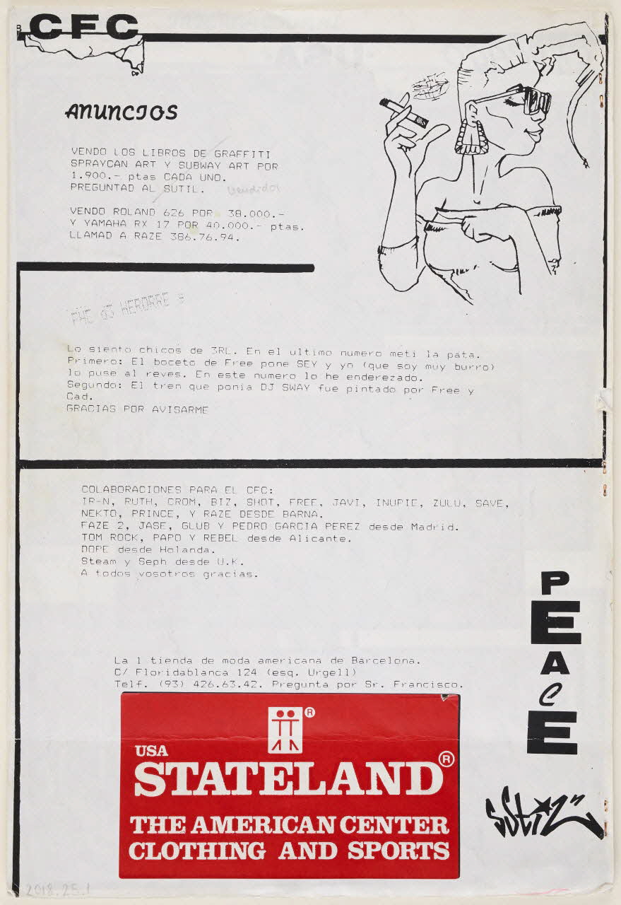 Fanzine en noir et blanc dédié au hip-hop rédigé en espagnol avec en première page un dessin de Zeta.Inscriptions