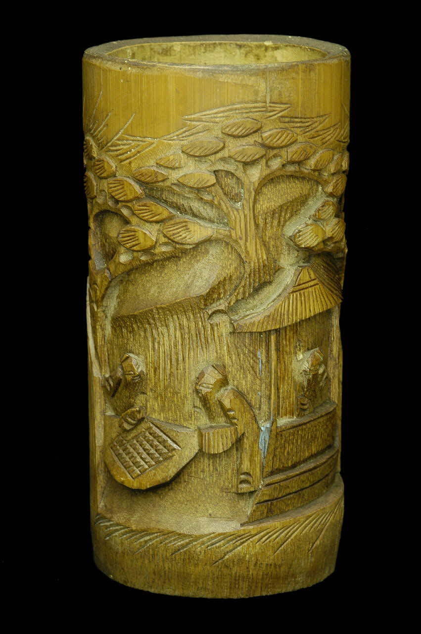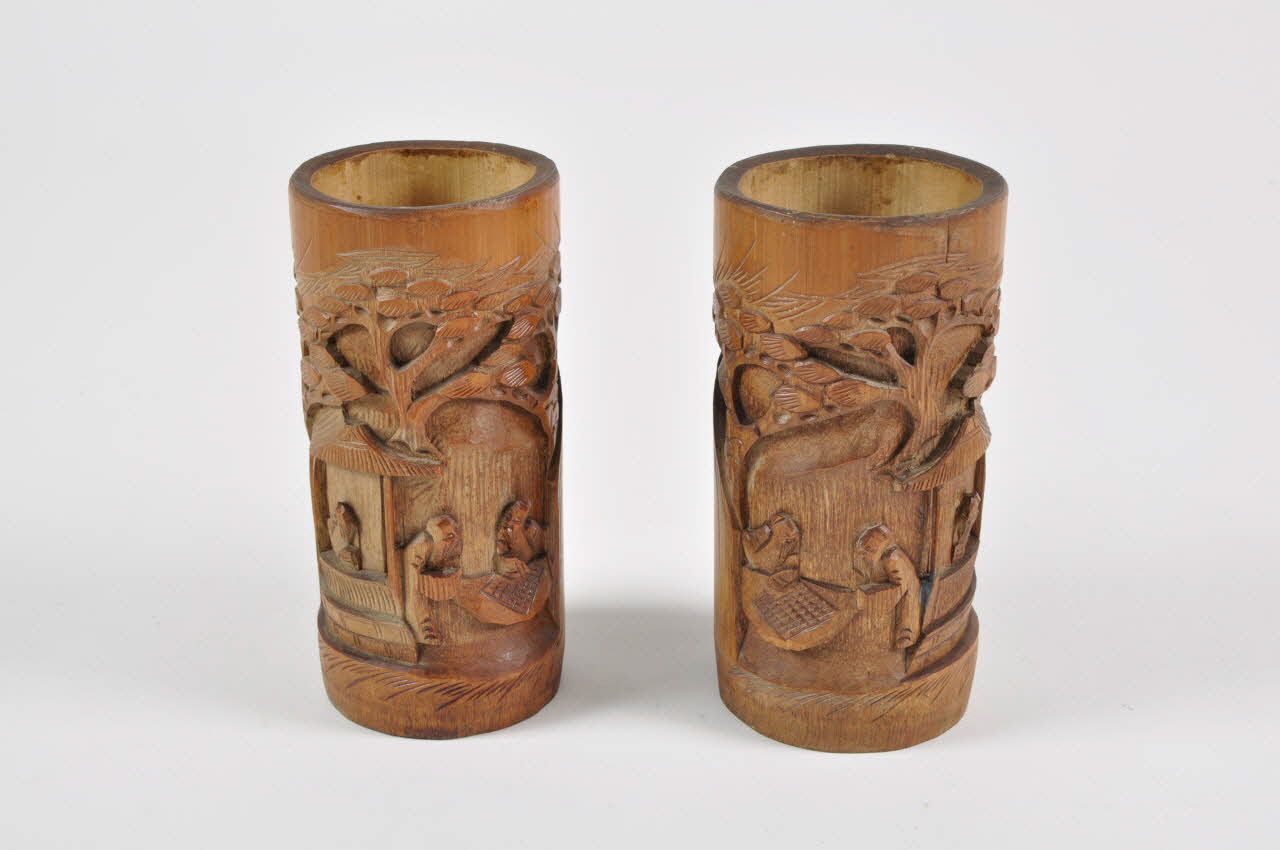 Deux vases en bambou dont la surface extérieure est sculptée. Les décors représente la même scène mais symétriquement oposée.