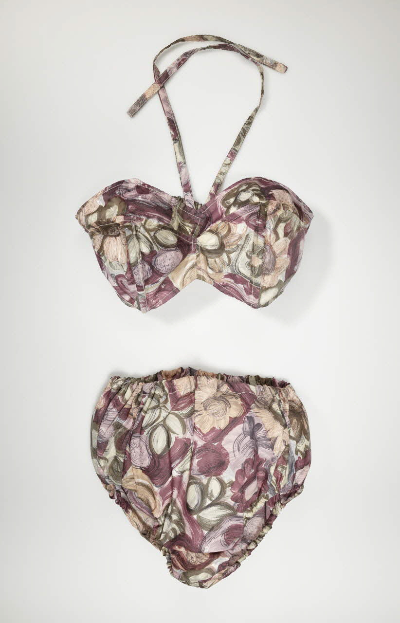 Maillot de bain de femme, deux pièces, en satin de fibres synthétiques imprimé mauve, kaki, saumon, gris et rose pâle à motifs de fleurs stylisées.
