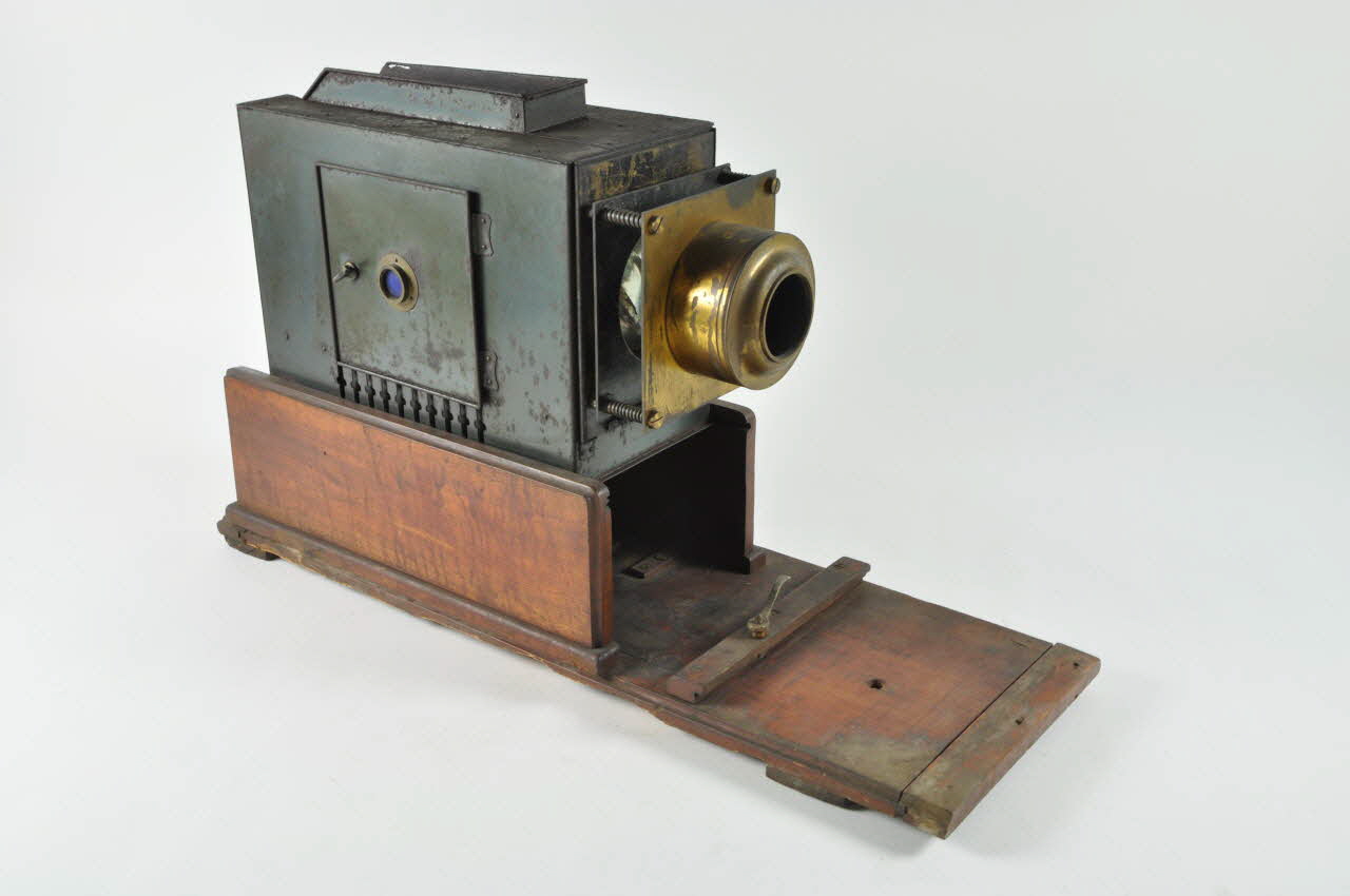 Boîte en fines plaques métalliques, de forme rectangulaire, ouverte sur l'arrière et le dessus. La surface du métal est, sur l'extérieure, peinte en noir. L'avant de la boîte est évidée d'un large disque, comblé par une lentille de verre, convexe. Celle-ci est devancée par un cadre métallique adapté. Devant vient se fixer un large cylindre de métal cuivré.
