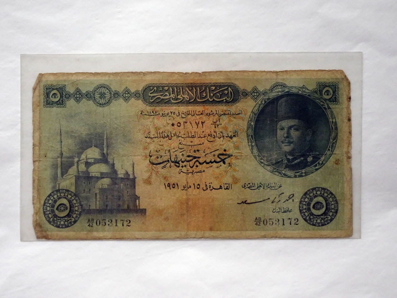 L'une des dernières émissions au portrait du roi Farouk. Sur les billets d'une livre au moins, le portrait de Farouk dans le médaillon a brièvement remplacé l'image de Toutânkhamon en 1950, avant de lui céder à nouveau la place dès mai 1952. Le fait que ce billet de la banque nationale a été imprimé en Angleterre est révélateur de la relation coloniale du royaume égyptienne à l'empire britannique.