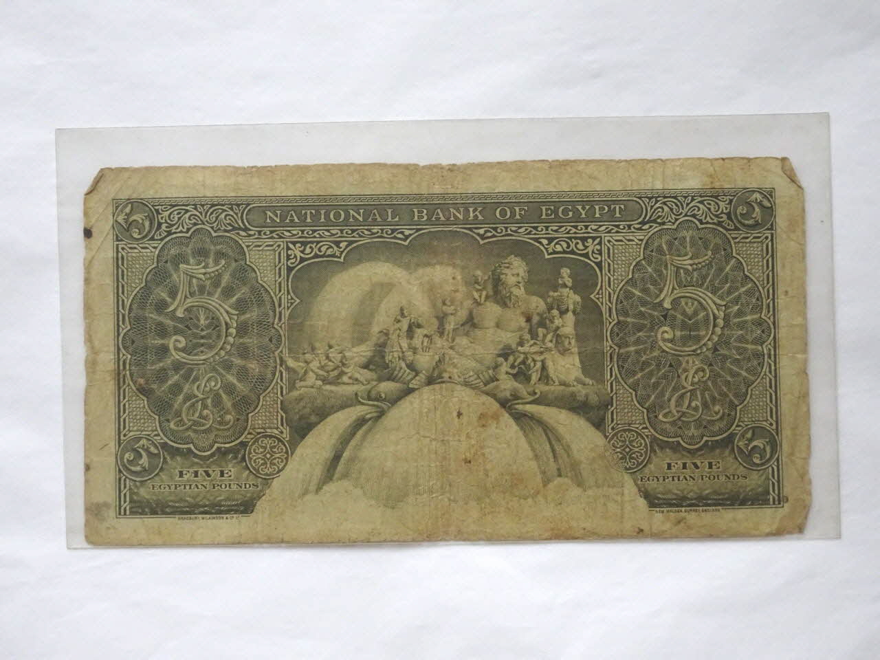 Billet de banque rectangulaire. A l'avers, dans un médaillon à droite, un portrait du roi Farouk portant le tarbouche. Dans le coin inférieur gauche, la mosquée de Mohamed Ali. Des inscriptions en arabe occupent la partie centrale, dont un cartouche calligraphié près du bord supérieur. Au revers, une fontaine surmontée d'une statue de type romain représentant le Nil comme un homme barbu allongé, accoudé sur un sphinx, entouré de putti, entre deux médaillons portant l'inscription 5LE.Inscriptions