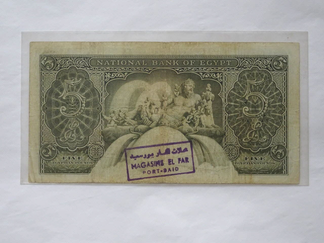 Billets de banque rectangulaire. A l'avers, dans un médaillon à droite, le buste d'une statue de pharaon portant le némès. Dans le coin inférieur gauche, la mosquée de Mohamed Ali. Des inscriptions en arabe occupent la partie centrale, dont un cartouche calligraphié près du bord supérieur. Au revers, une fontaine surmontée d'une statue de type romain représentant un homme barbu allongé, accoudé sur un sphinx, entouré de putti, entre deux médaillons portant l'inscription 5LE. Sur le jet de la fontaine, un cachet rectangulaire apposé à l'encre au nom des magasins El Far à Port-Saïd.Inscriptions