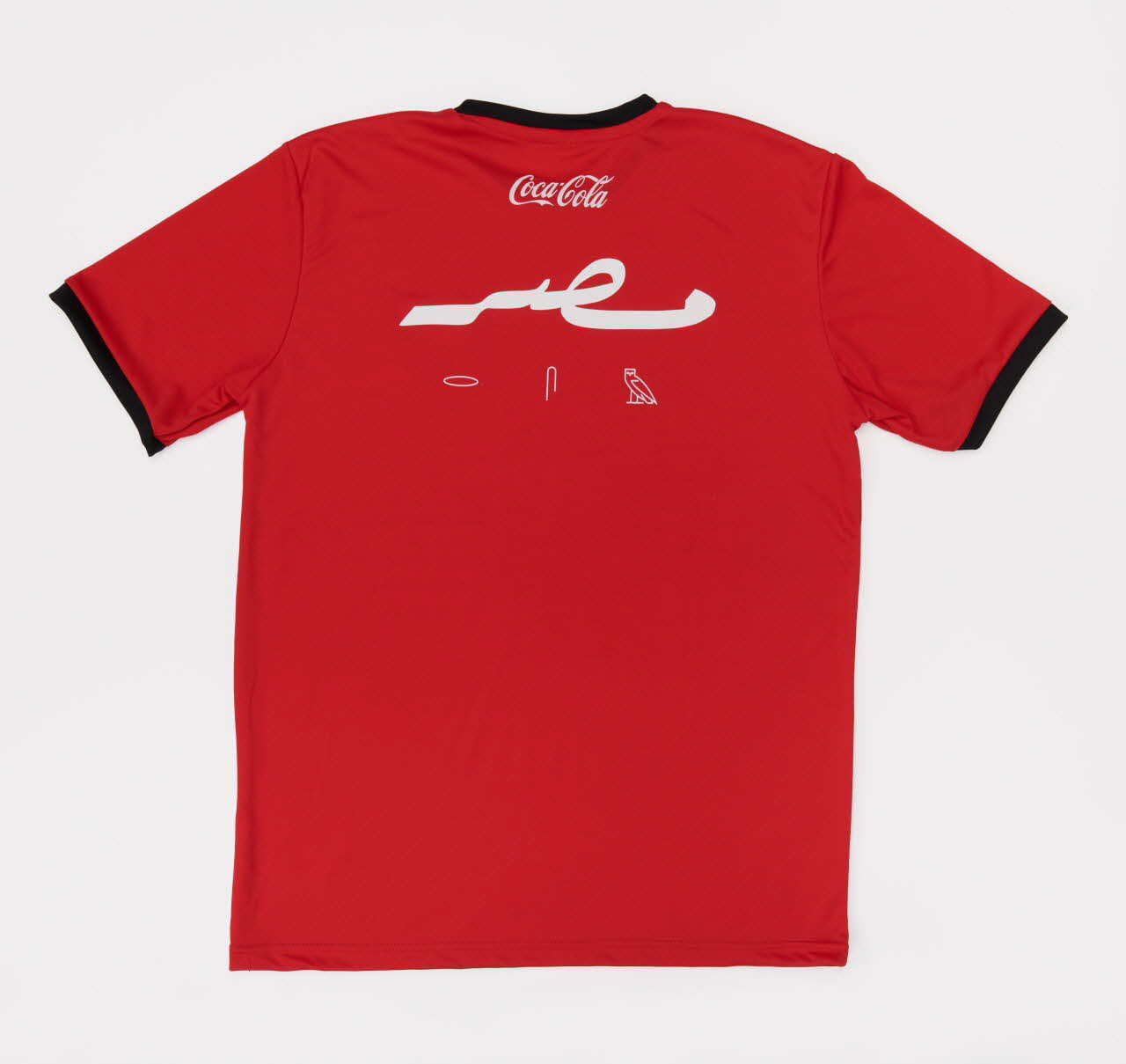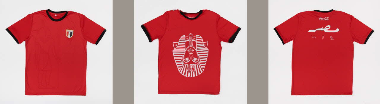 Lieu : EgypteDate : 2018Utilisateur : Coca-ColaDestiné à flatter le sentiment national des supporters et des consommateurs de Coca-Cola, la marque a multiplié sur ce vêtement les symboles égyptiens modernes et pharaoniques. Le rouge est la couleur du maillot de l’équipe nationale. Le blason placé sur le cœur est le drapeau de la République arabe d’Égypte. Une figure divine, représentée selon les canons pharaoniques, est tissée en filigrane sur le torse. Au dos, le nom arabe de l’Égypte, Misr, est écrit en arabe et transcrit phonétiquement en hiéroglyphes. Au revers, à l’avant, un dessin du masque funéraire de Toutânkhamon est imprimé de telle sorte que le visage du pharaon vient recouvrir celui du supporter qui passerait le t-shirt par-dessus sa tête, imitant le geste d’exultation de certains joueurs après un but.