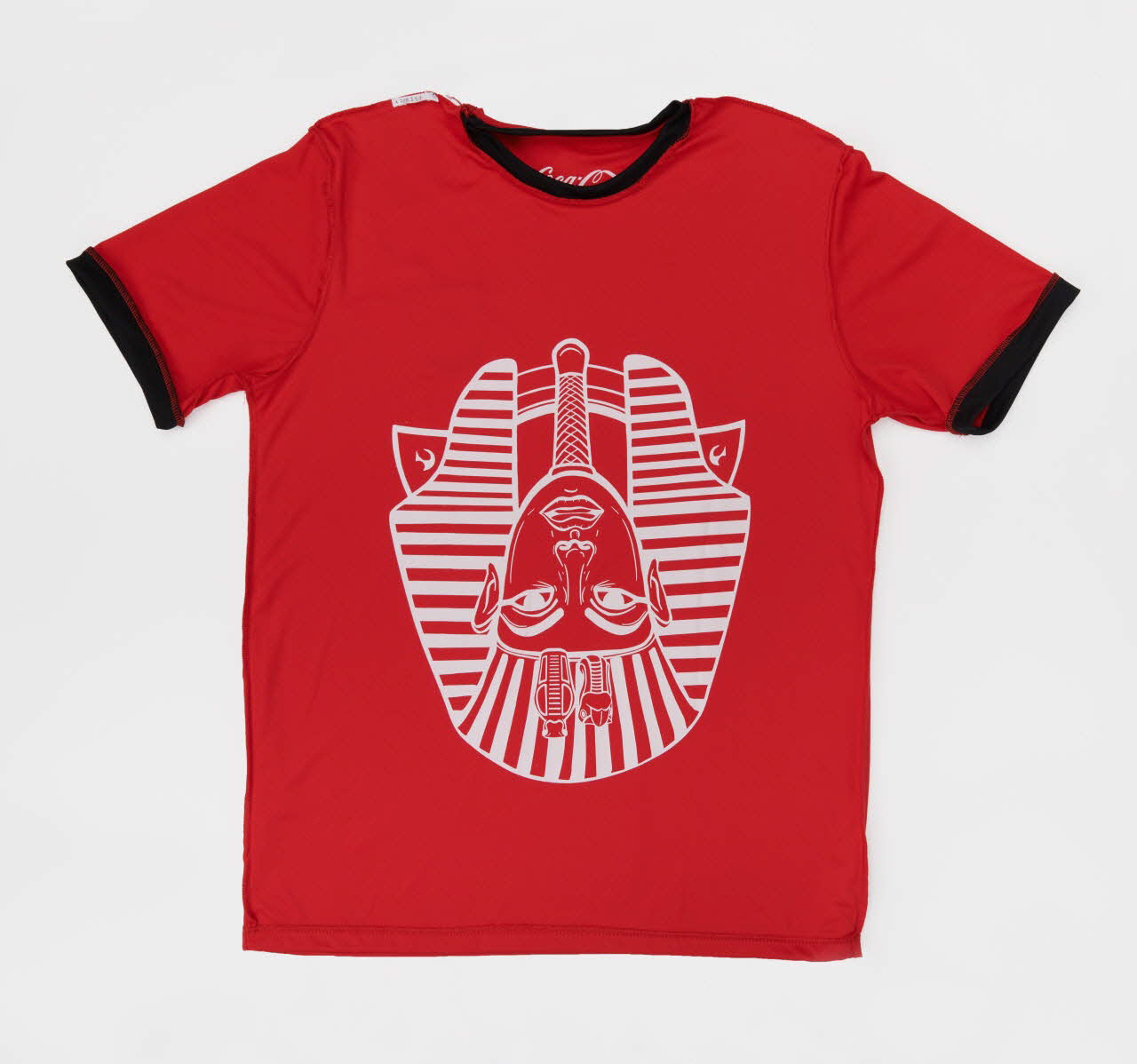 De : Lieu : EgypteDate : 2018Produit et diffusé par Coca-Cola pour la Coupe du Monde de football 2018. C'était la première fois que l'Égypte participait à l'événement depuis 1990 et les supporters plaçaient de grands espoirs dans l'équipe nationale, notamment grâce à la participation de Mohamed Salah. On ignore quelle est la part des impulsions de la firme internationale et celle de l’inspiration nationale égyptienne dans le choix des images pharaoniques qui recouvrent ce t-shirt. Il n’en reste pas moins que celui-ci est représentatif du recours aux références pharaoniques – au premier rang desquelles le très célèbre masque de Toutânkhamon – par les Égyptiens dans un contexte d’unité et d’exaltation nationales (comme lors des révolutions de 2011 et 2013). Il n’est pas anodin que l’équipe nationale de football soit surnommée les Pharaons. Ce sobriquet lui a probablement été donné de l’étranger, mais il est parfaitement adopté par la population égyptienne.
