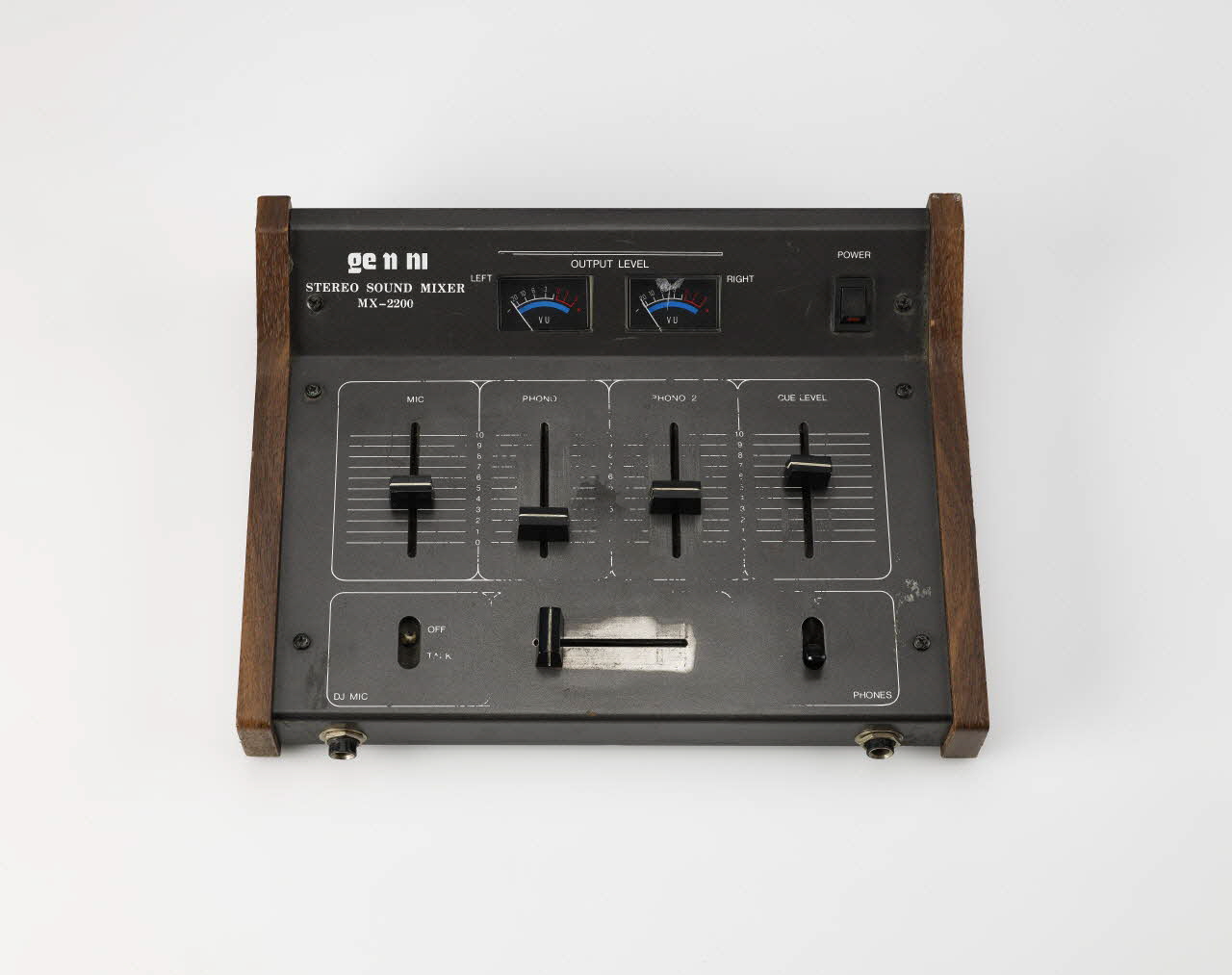 Table de mixage usagée de couleur noire et marron. Inscriptions en blanc sur fond noir.