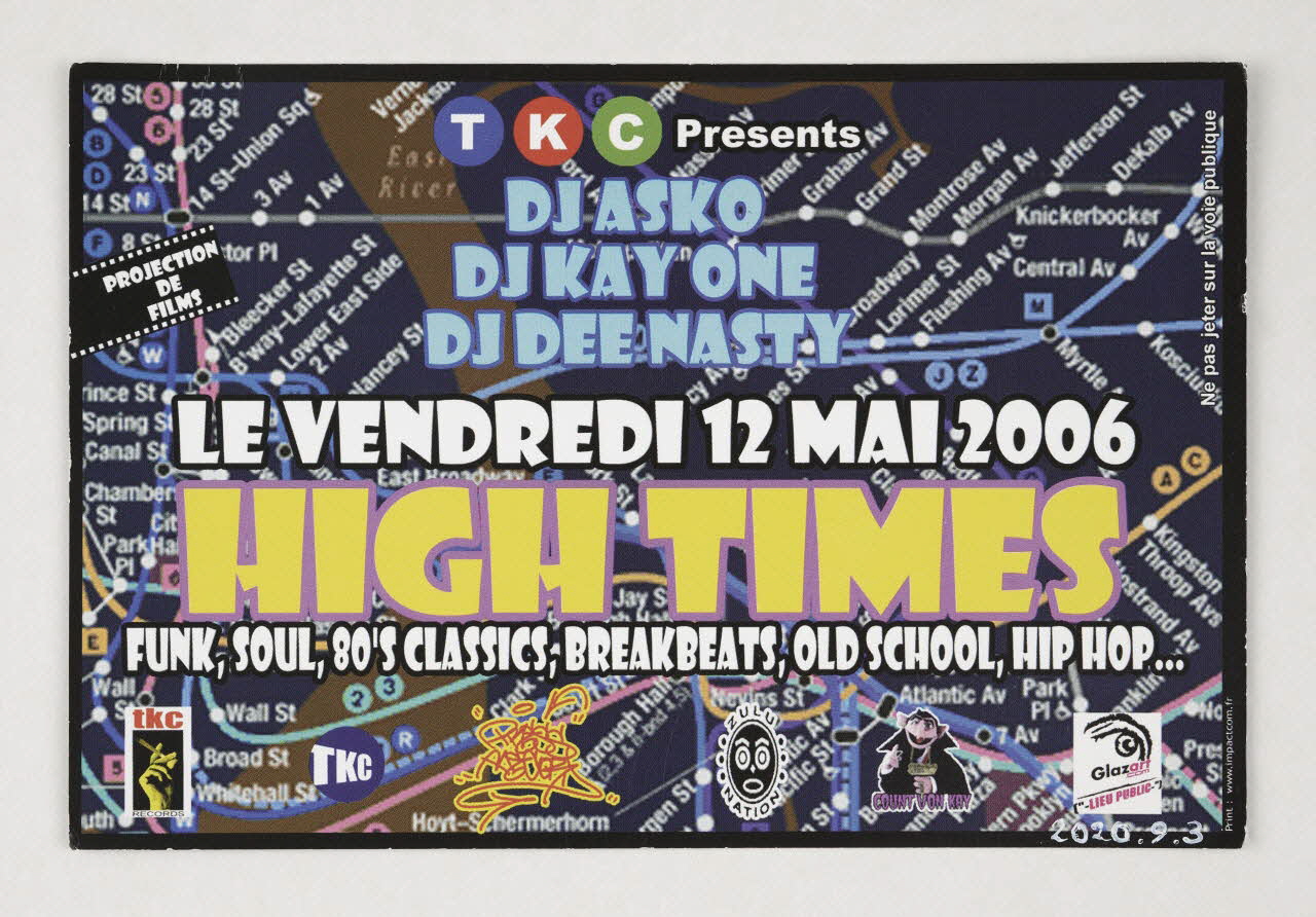 Date : 2006Flyer publicitaire pour un concert de DJ Kay One DJ Asko DJ Dee Nasty intitulé "High Times".