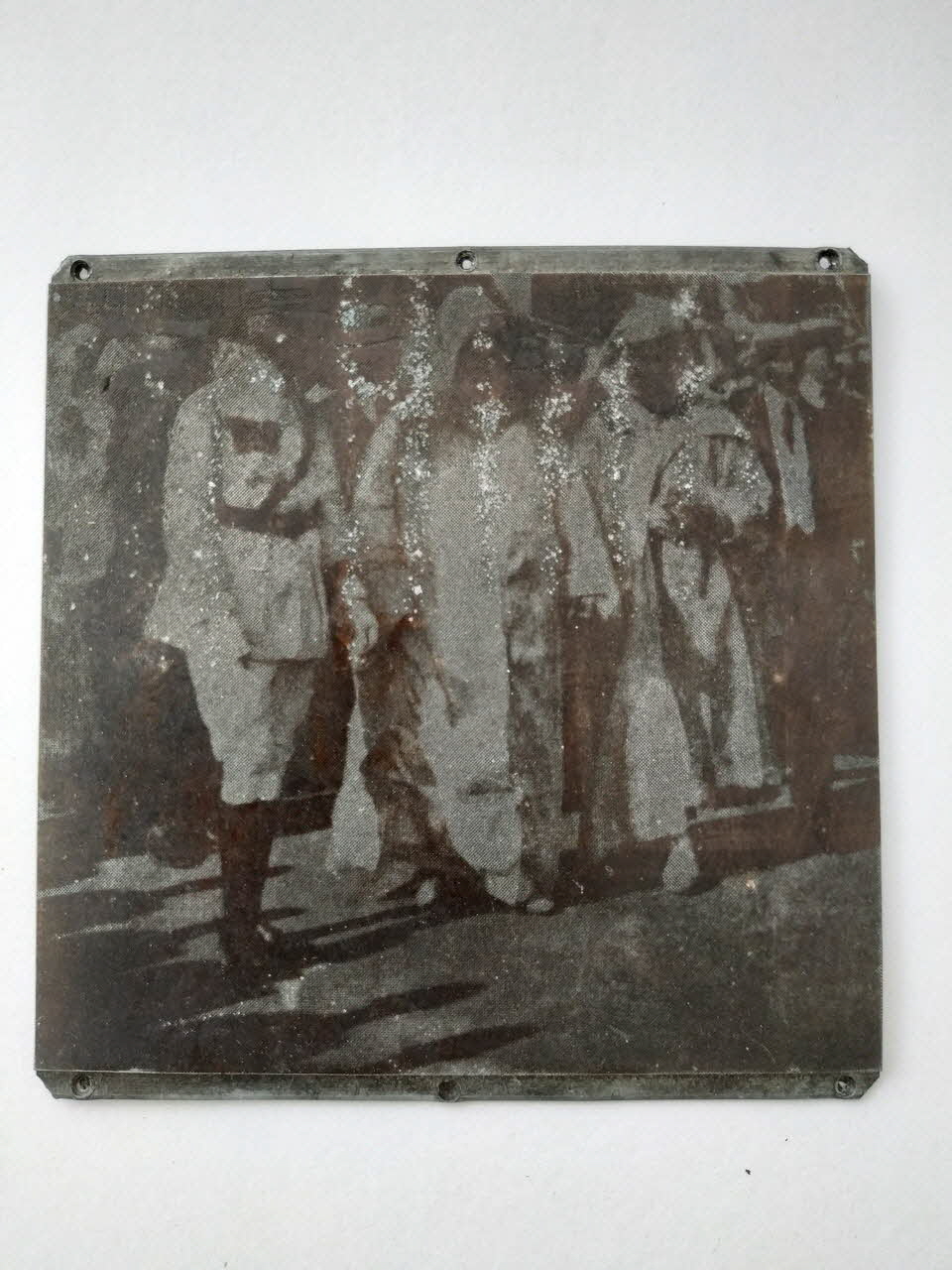 Plaque en métal gravé pour la reproduction de la photographie d'une revue militaire par Théophile Jean Delaye.Plaque de métal dotée de six percements.Décor