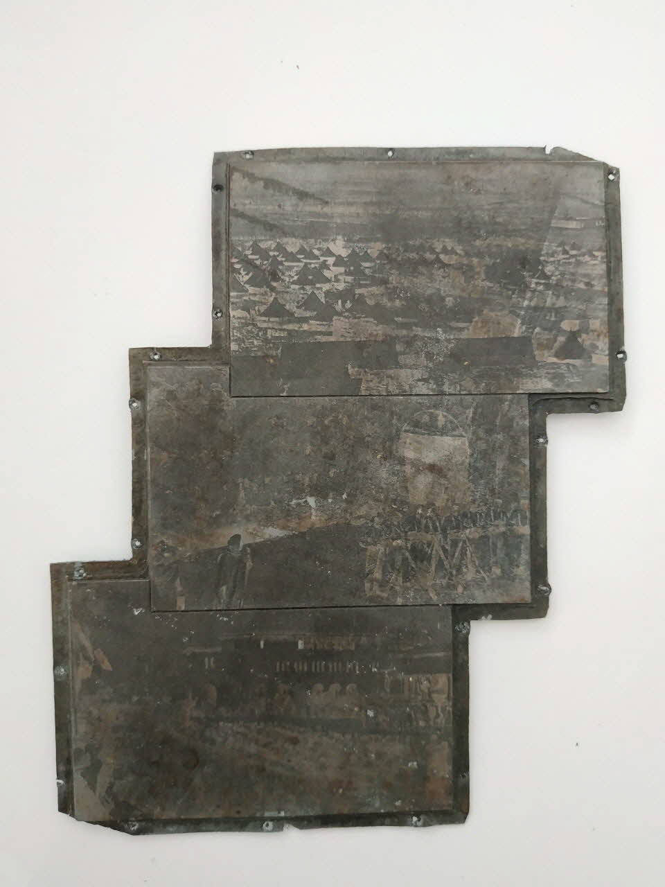 Plaque d'impression gravée permettant la reproduction imprimée de trois photographies disposées à l'italienne et superposées, avec la vue d'un village de tentes, d'une revue militaire et d'un bâtiment de Rabat, par Théophile Jean Delaye. Plaque de métal dotée de six percements.Décor