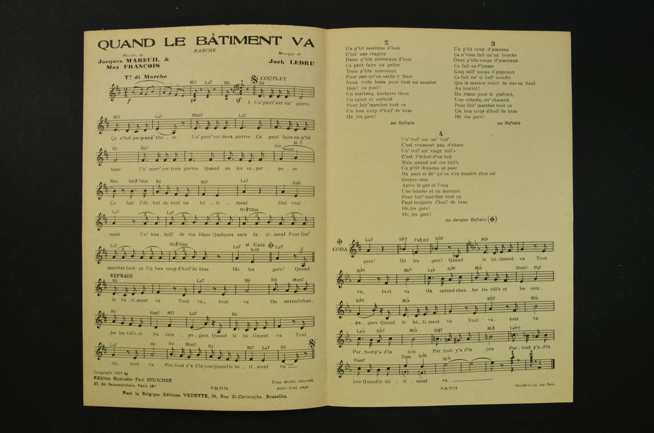 Sur la couverture, les portraits photographiques de Maurice Chevalier, Jacques Mareuil et Annie Cordy. Les inscriptions renseignent le titre de la chanson, le nom des auteurs, des artistes et de l'éditeur. A l'intérieur, partition et paroles de la chanson. Au dos, liste d'autres partitions publiées par l'éditeur.Matériaux et techniques