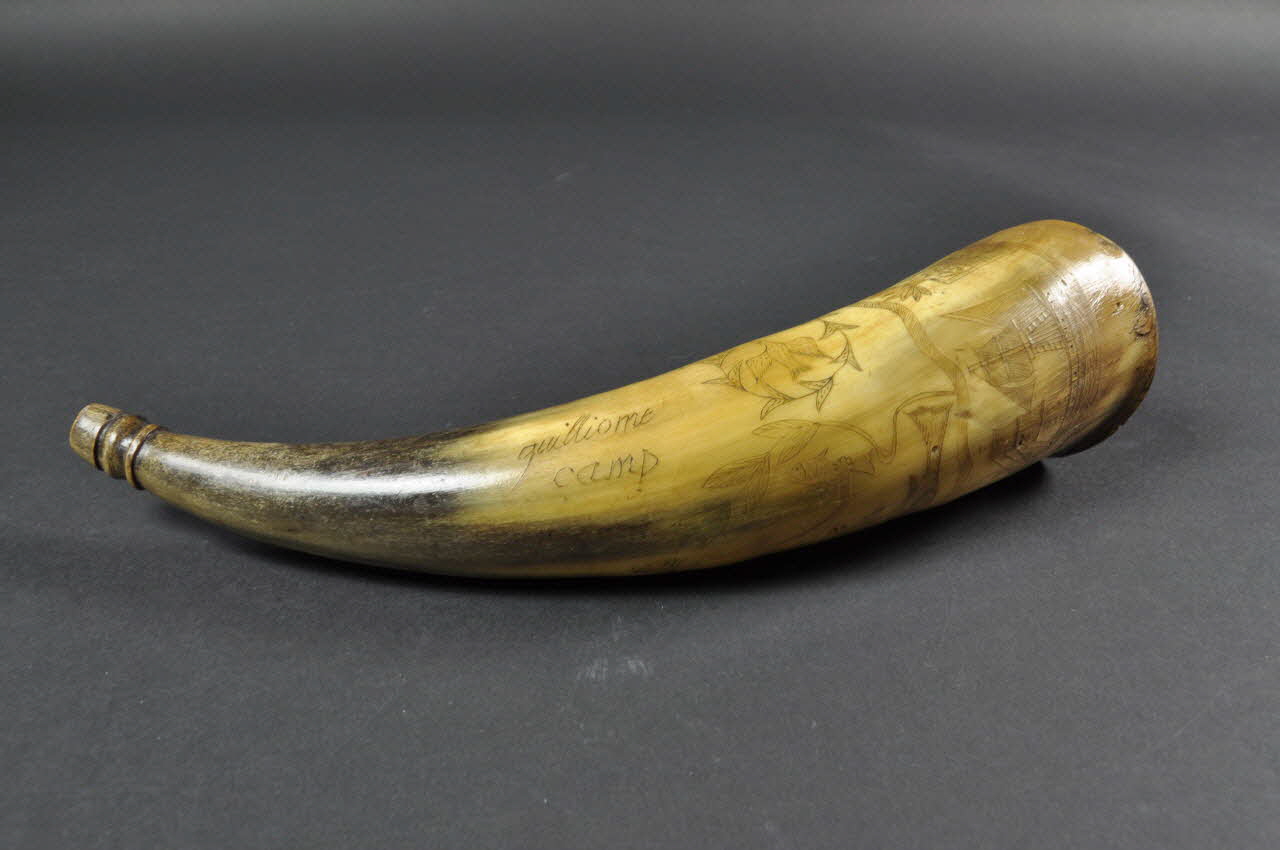 corne gravée et bois / Gravée dans la partie supérieure, d'une sirène et d'une étoile à huit bras soutenues de part et d'autre par deux colombes. Au milieu, au dessous de la sirène, un bateau à voile et un vase rempli de feuillages.