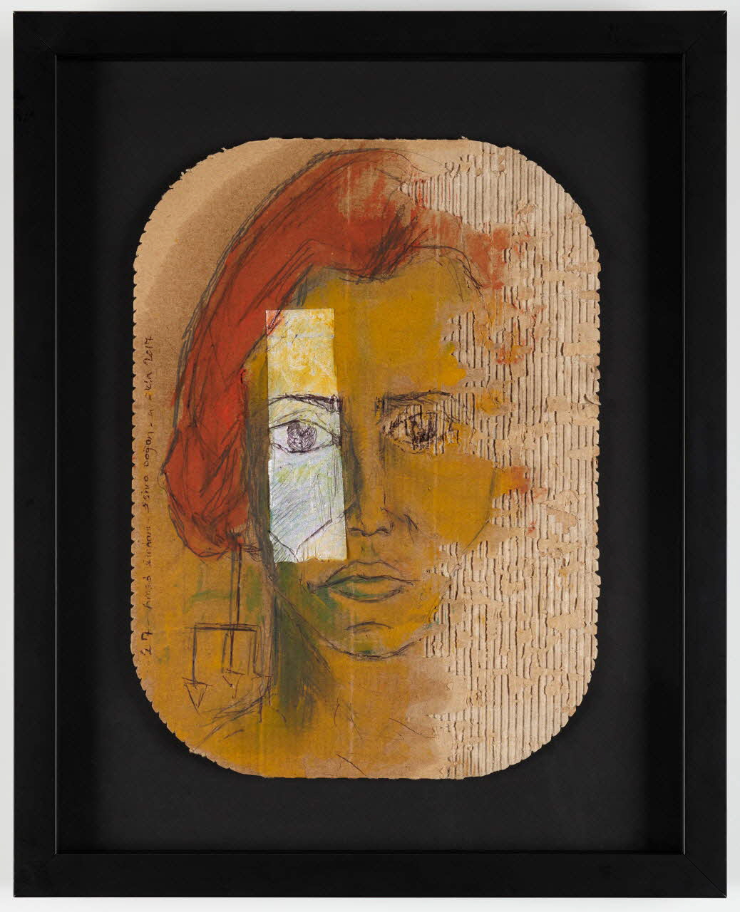 Dessin conçu à partir d' un morceau de carton de récupération et du collage d'un papier argenté, conservé d'une boîte de cigarettes, représentant un potrait de femme de face, aux cheveux colorés de rouge par l'utilisation de curcuma et de reste de coloration capillaire utilisée par une femme de la prison d'Amed.Décor