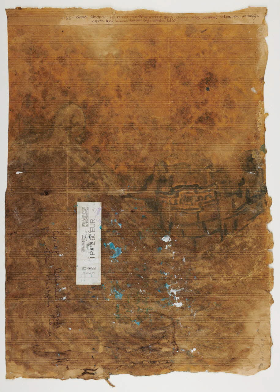 Dessin sur fond abstrait représentant une femme drapée, faisant penser à un oiseau en pied dans l'angle inférieur droit, et une pluie d'étoiles et de nuées sombres au dessus de la tête. Réemploi d'une grande enveloppe en papier kraft envoyée par un collectif de soutien de la ville de Martigues (Bouches du Rhône) intiulé "Rallumeur d'étoiles"; dessin au trait avec de la pâte dentifrice et de nombreux matériaux au fort pouvoir colorant (concentré de tomate, épluchures de grenade, aspirine, chou noir, cendres de cigarette, thé et café) lors de la détention à la prison de Amed.Inscriptions