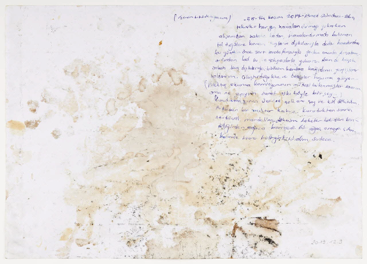 Dessin abstrait réalisé par l'apposition d'une feuille de papier blanc sur le sol de la cour de la prison de Mardin au matin, souillée par la fiente de pigeons et aspergée ensuite de café; l'effet obtenu donne l'impression d'une forme apparentée à un arbre que l'auteur identifie dans le texte porté au revers comme "mon arbre prisonnier".Inscriptions