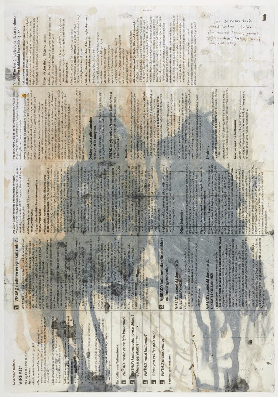 Dessin représentant deux grands oiseaux noirs affrontés réalisés en noir avec différentes matières colorantes (restes alimentaires, cendre de cigarette, encre et curcuma) sur une notice de médicament ( rétroviral Viread).Inscriptions