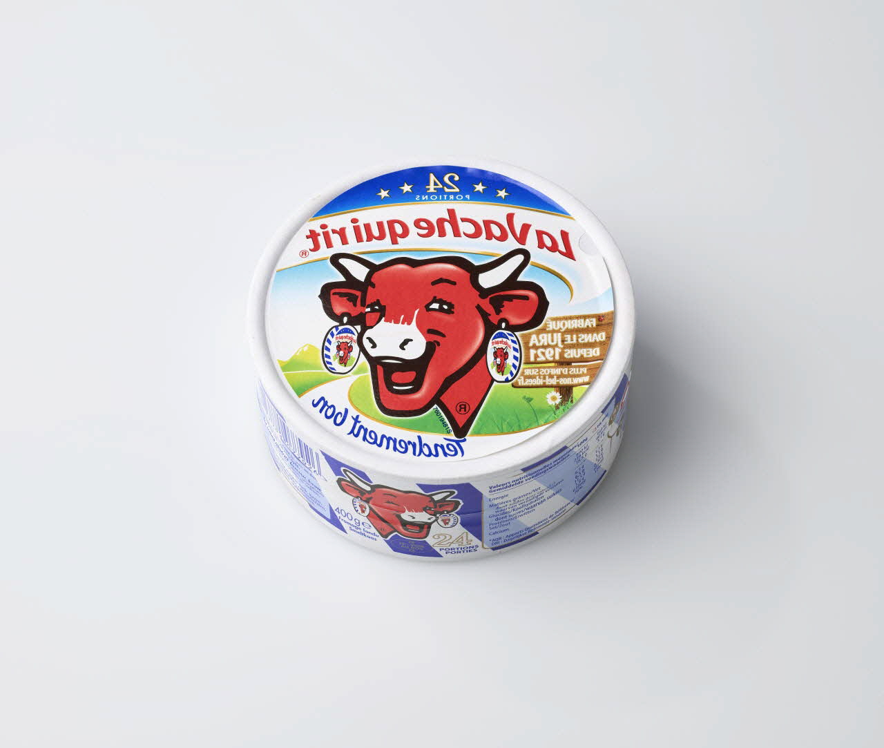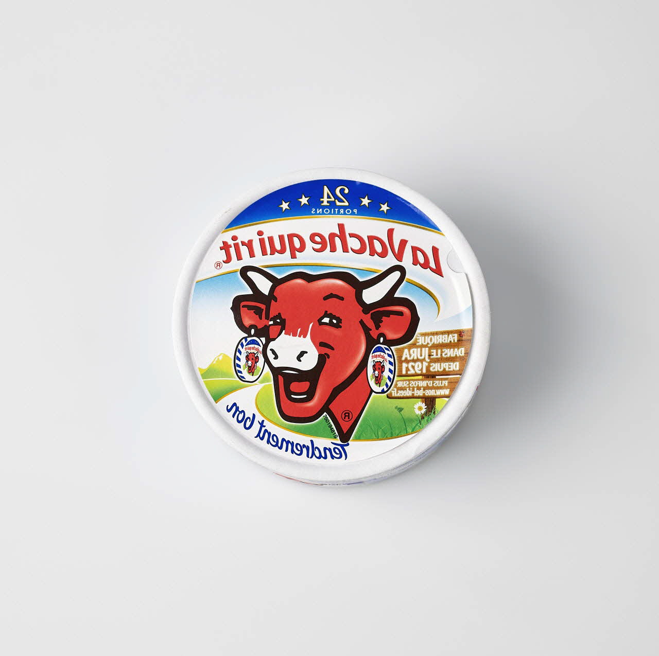 Boîte contenant 24 portions de fromage. Elle représente l’image originale de la Vache-qui-rit, mais une modification technique vient inverser complètement l’image. La vache regarde alors dans l’autre direction, les écritures sont disposées en miroir.Inscriptions