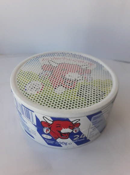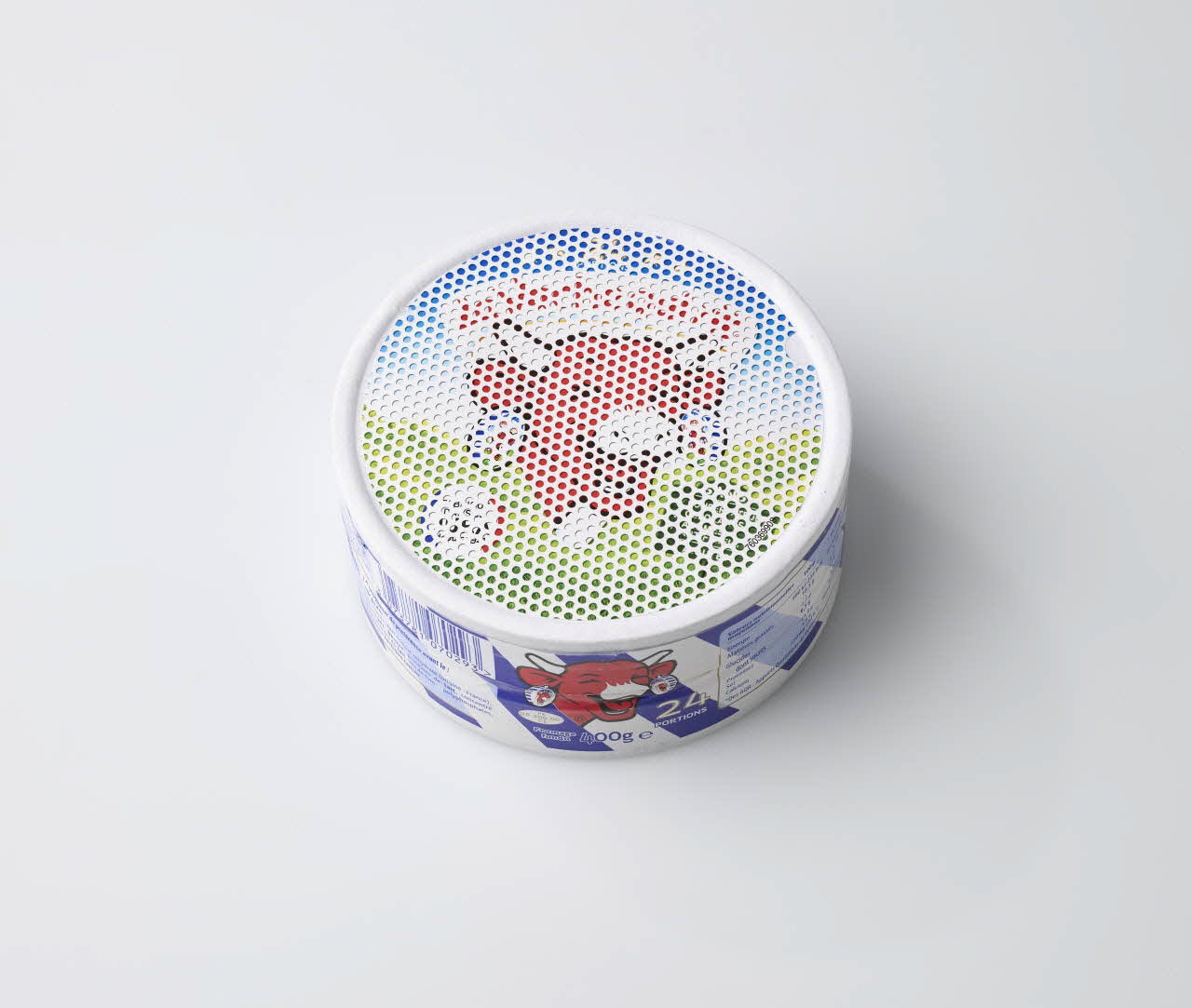 Boîte contenant 24 portions de fromage. Elle représente la vache hilare sur fond de campagne verdoyante, le tout à travers un écran blanc perforé d’une multitude de petits trous.Décor
