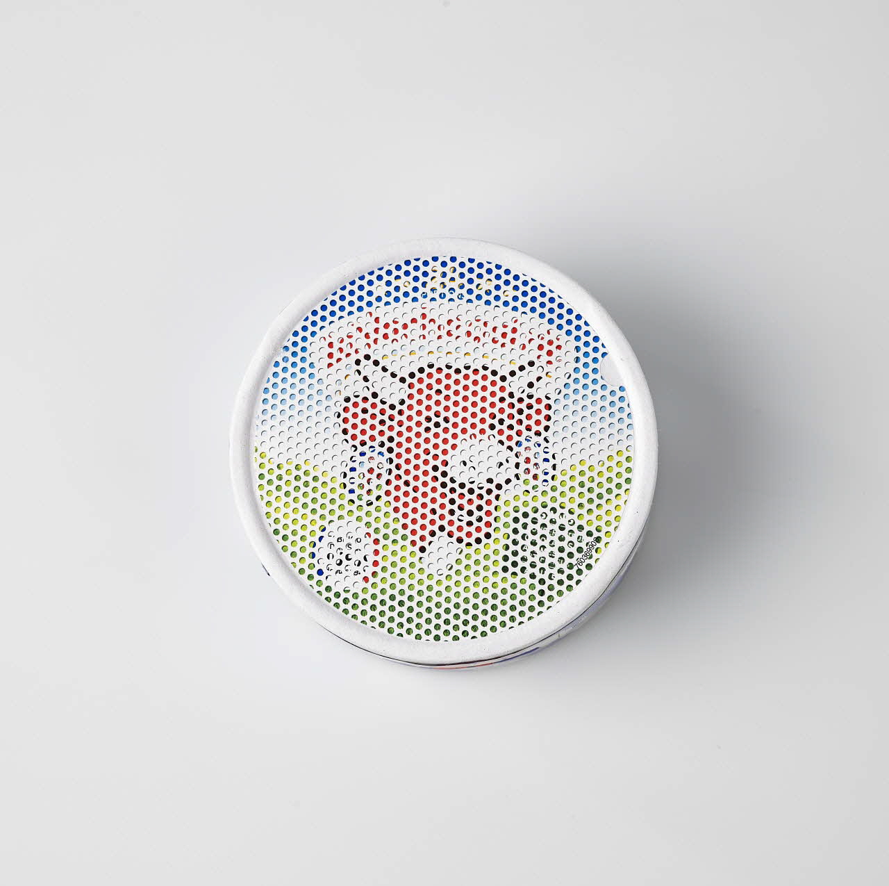 Pour fêter son 100e anniversaire en 2021, La Vache qui rit lance avec Lab’Bel et le Bel Group Art Laboratory une série de collaborations avec des artistes contemporains pour la création d’une série exceptionnelle de Boîtes édition collector. Renouvelée chaque automne, cette initiative originale actualise et renforce un lien de longue date entre la marque et les artistes contemporains. En effet, il y a presque 100 ans, Léon Bel s’inspirait d’une illustration de Benjamin Rabier pour lancer ce qui allait devenir une des plus grandes marques de fromage industriel. Cinquième artiste à participer à cette édition de « Boîtes collector », Karin Sander joue sur notre façon d’appréhender les objets ou les situations au quotidien en modifiant notre perception par de multiples altérations. Elle modifie ainsi notre perception du monde pour mieux affûter notre regard. Elle utilise pour cette cinquième édition Collector de la Boîte de Vache qui rit la même matrice que dans sa série Reisebilder (Photos de voyage), où elle recouvrait la vision d’une vitre de wagon par des publicités altérant la visibilité des voyageurs, contraints d’observer le monde à travers une grille de pointillés. De la même manière, en observant le paysage de campagne et la vache hilare à travers cet écran perforé blanc, nous sommes d’abord irrités, avant de redécouvrir cette image iconique d’une nouvelle manière, évoquant un style pointilliste, une sérigraphie ou encore une impression numérique pixellisée.