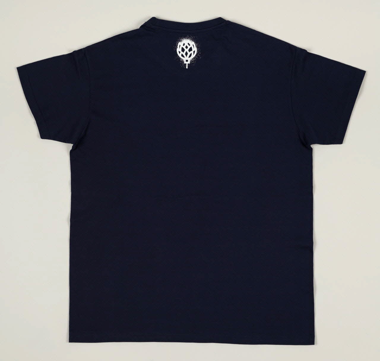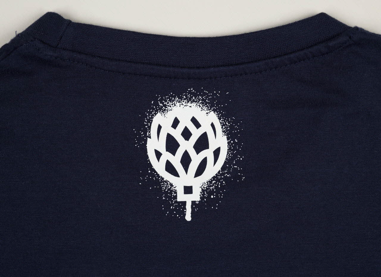 Tee-shirt bleu marine coupe droite avec au recto un wagon de métro new-yorkais imprimé en blanc et au verso le logo de sa marque en forme d'artichaut.Décor