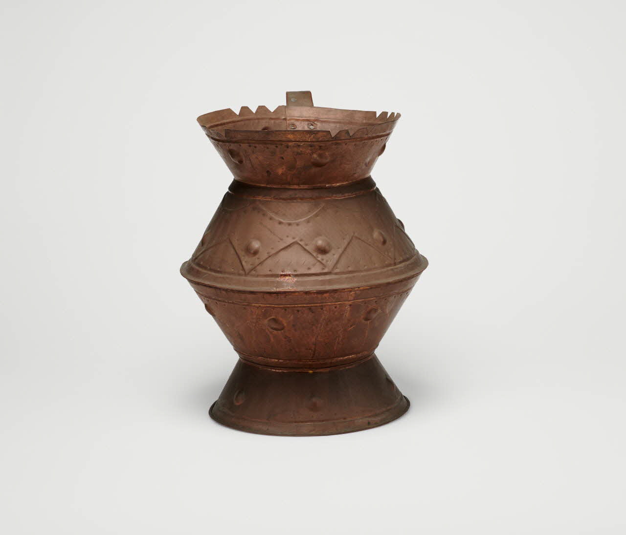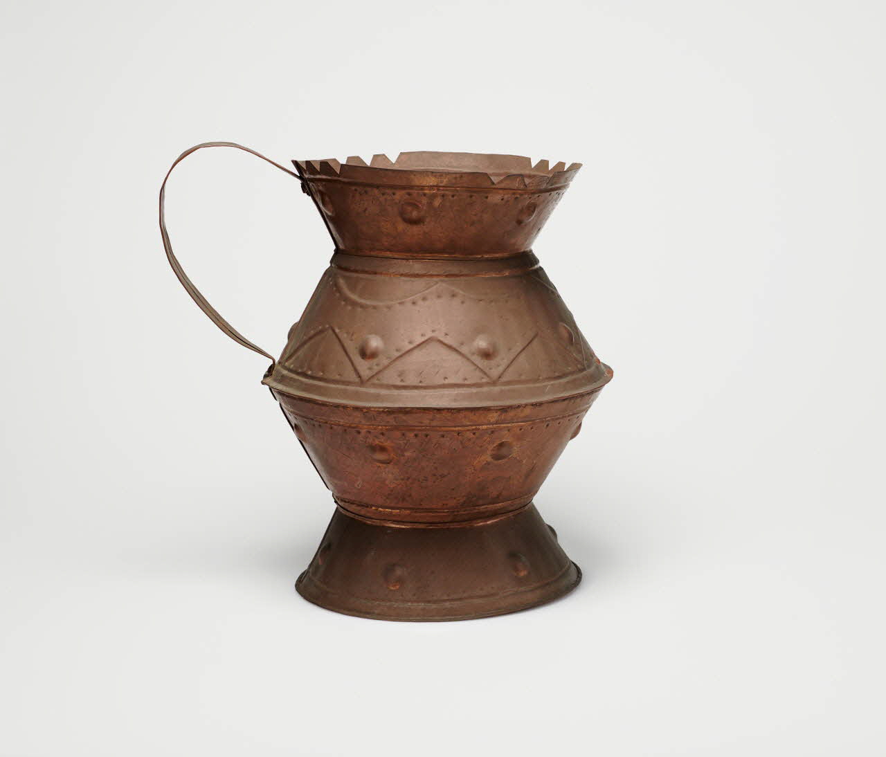 Jarre en cuivre possédant un pied tronconique, une panse renflée, un col évasé ainsi qu'une anse de préhension. Elle est décorée de cercles en relief ainsi que de motifs de chevrons sur la panse. Le bord du col est découpé en forme de zig-zag. Des inscriptions en italien sont imprimées sur les plaques de cuivre.Décor