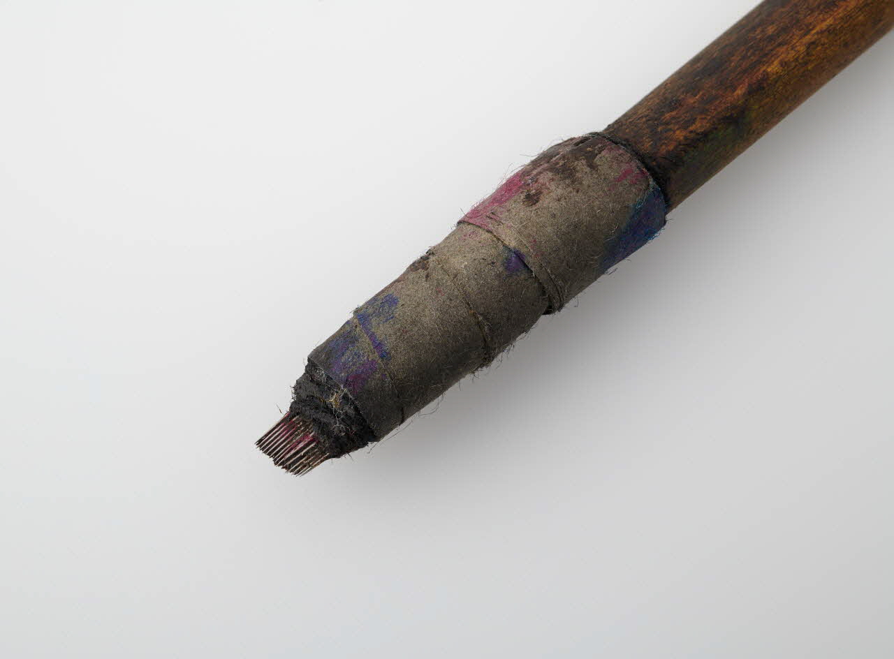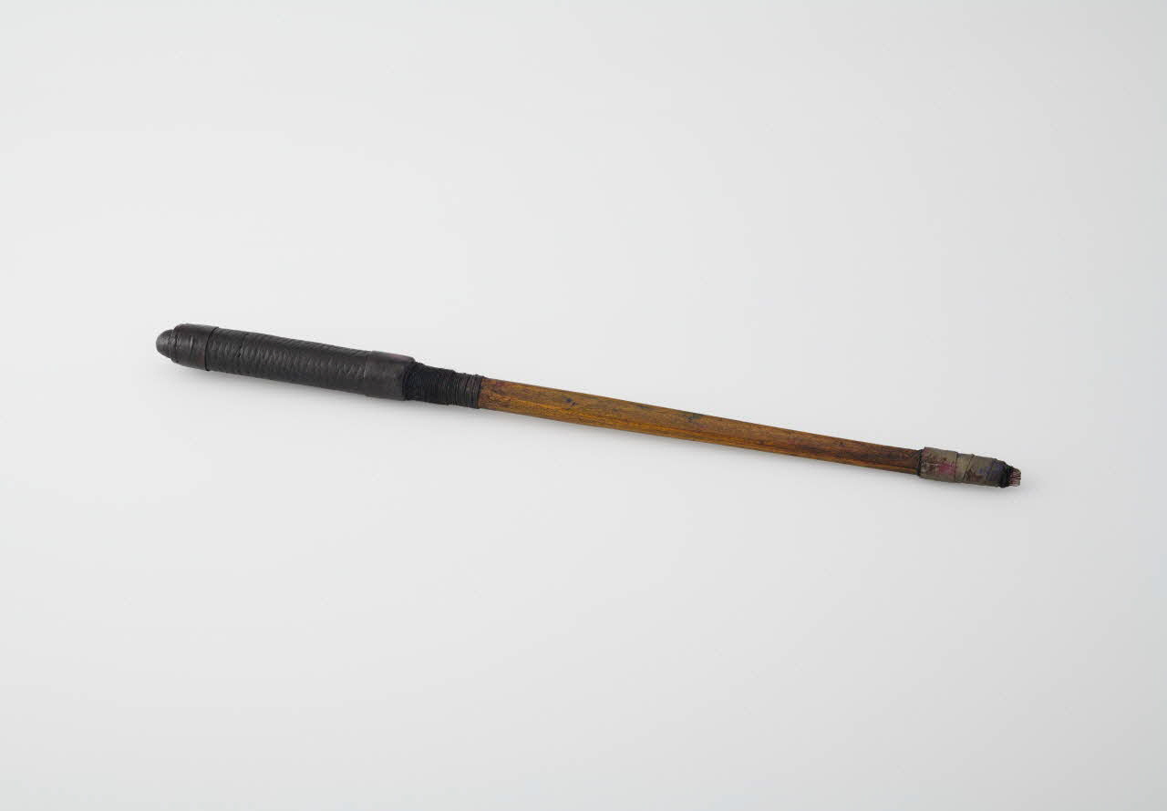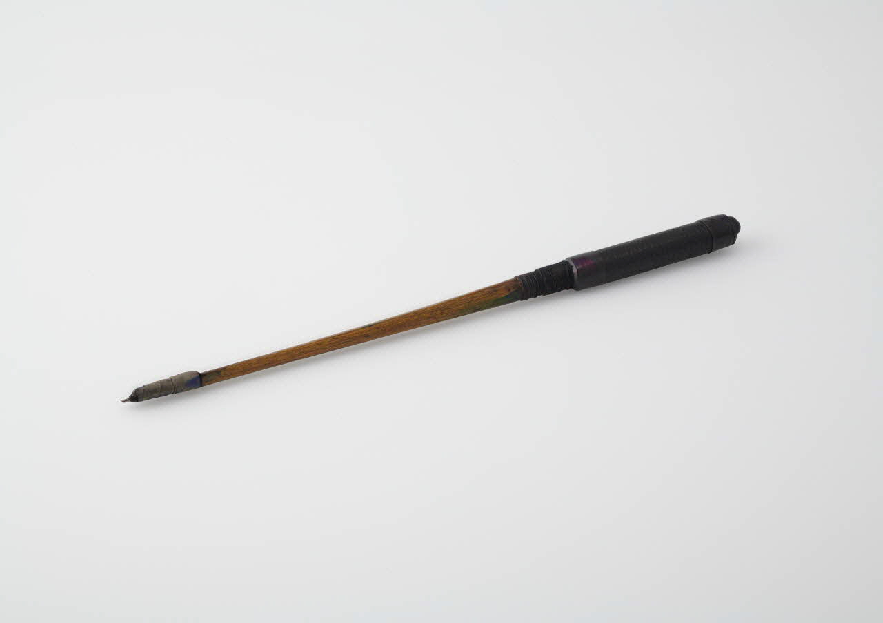 Baguette en bois dur (thuya?) taillé avec embout formé de plusieurs aiguilles à tatouer en acier maintenu au bout de la baguette par un papier collant gris. Le manche arrondi est recouvert d'un morceau de cuir grainé noir maintenu par deux bandes de cuir lisse, cousue à la base et entourée d'une ficelle noire vers la baguette.Matériaux et techniques