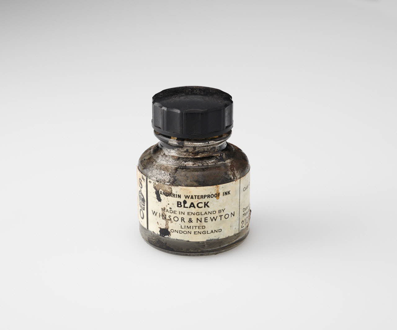 Flacon d'encre de Chine en verre moulé transparent avec col pour visser un bouchon en plastique noir et papier blanc imprimé et collé pour l'étiquette avec le dessin de la couronne royale britannique. L'encre noire s'est asséchée et agglomérée à l'intérieur du flacon.Matériaux et techniques