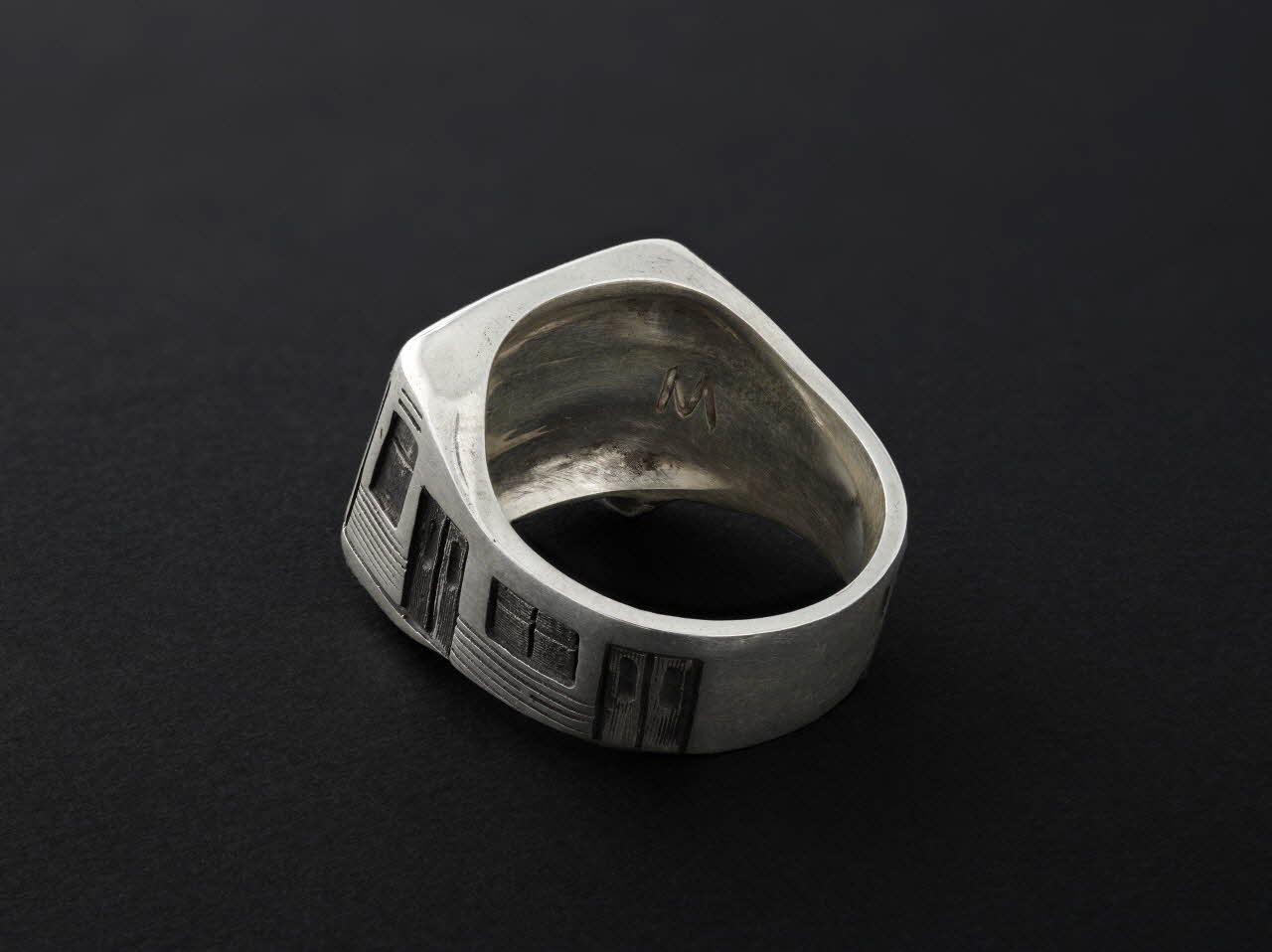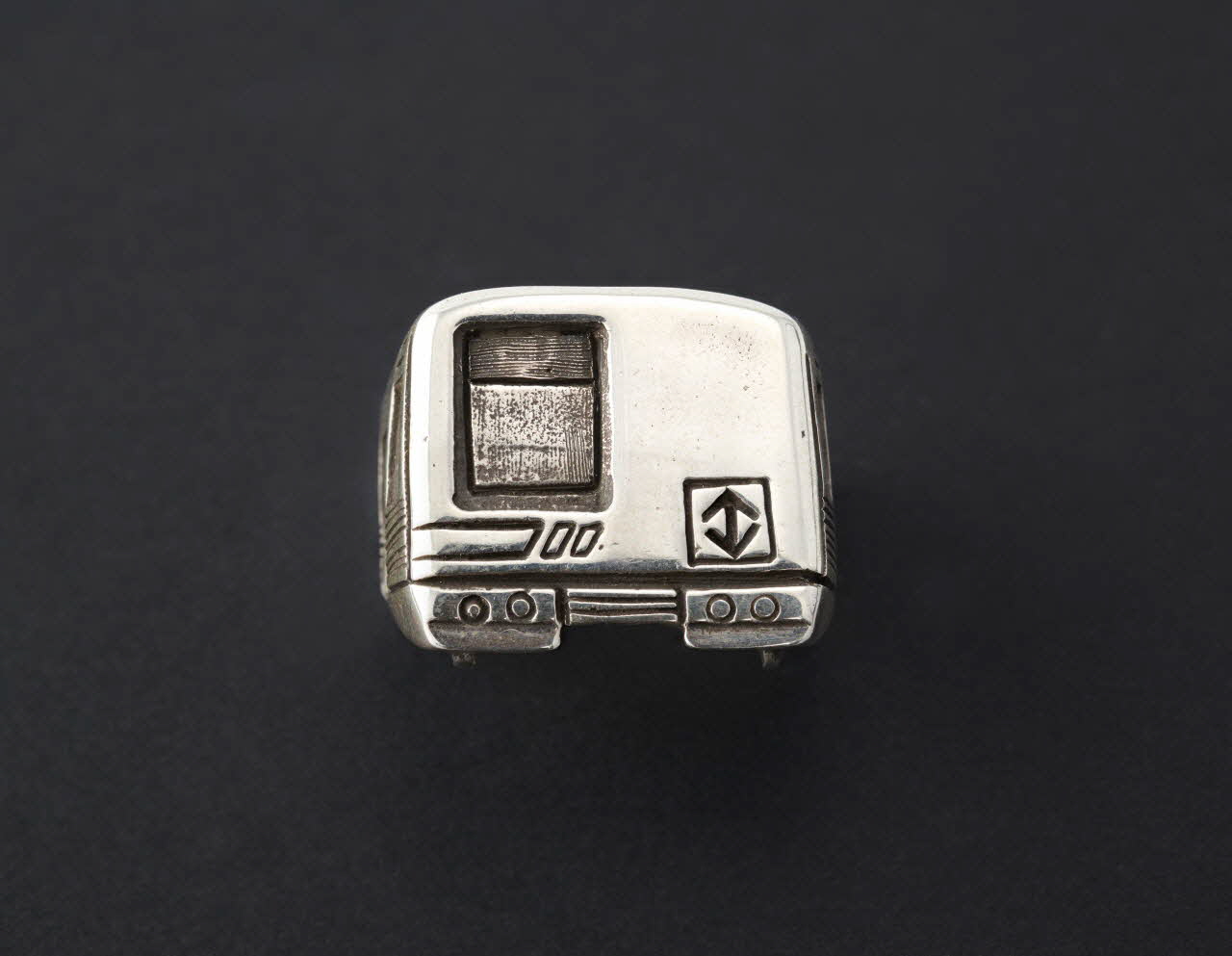 Bague en argent 925 carats moulée à la cire perdue. Le dessus de la bague reproduit fidèlement la forme de la tête du métro de Sao Paolo.Inscriptions