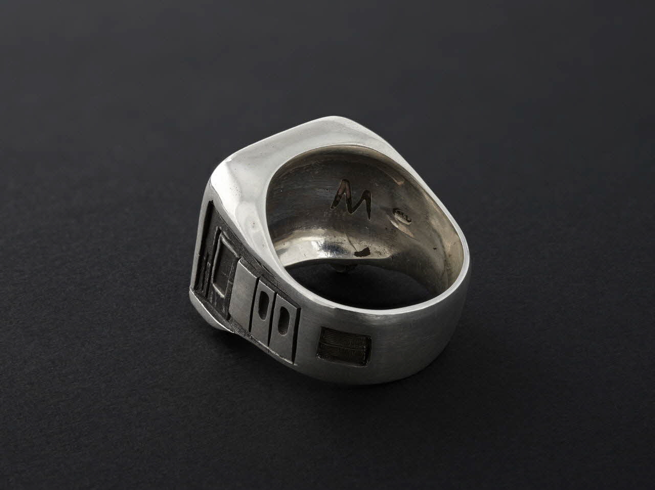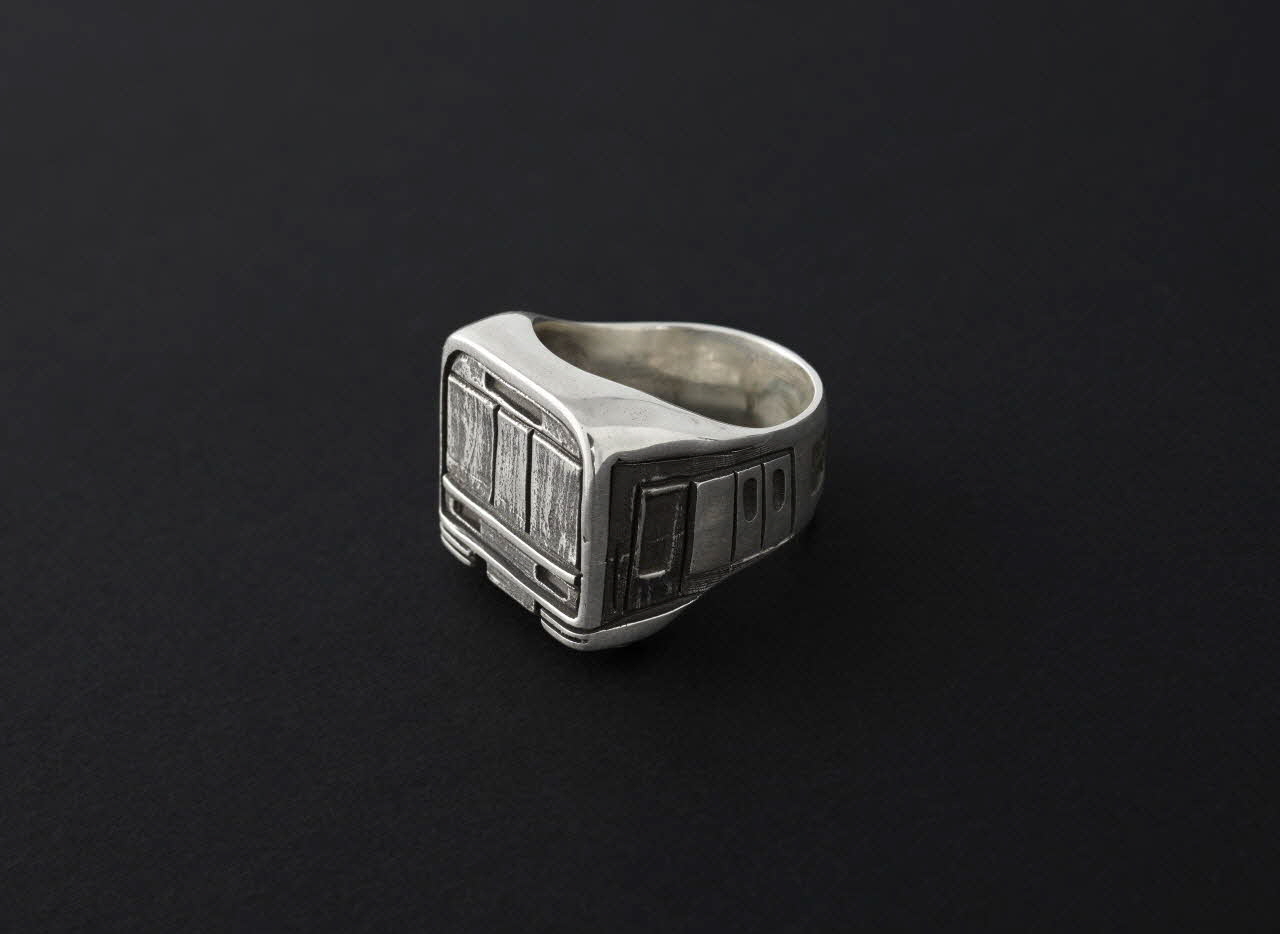 Bague en argent 925 carats moulée à la cire perdue. Iconographie : tête du métro de Milan (ligne jaune, numéro 3).Inscriptions