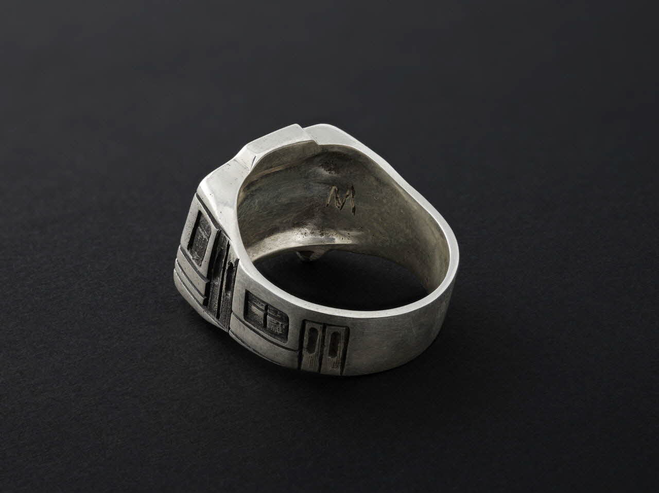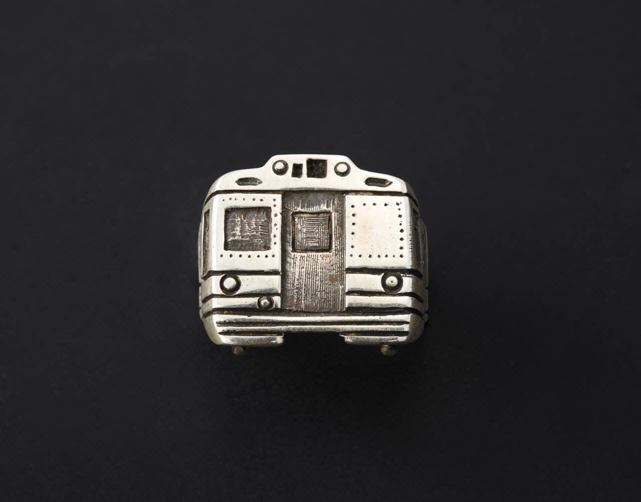 Bague en argent 925 carats, moulée à la cire perdue. Iconographie : tête du métro de New York.Inscriptions