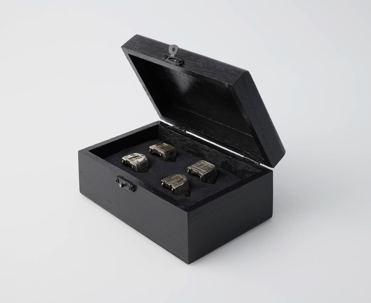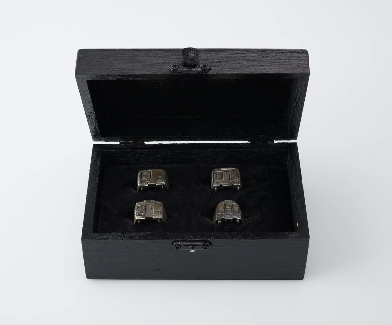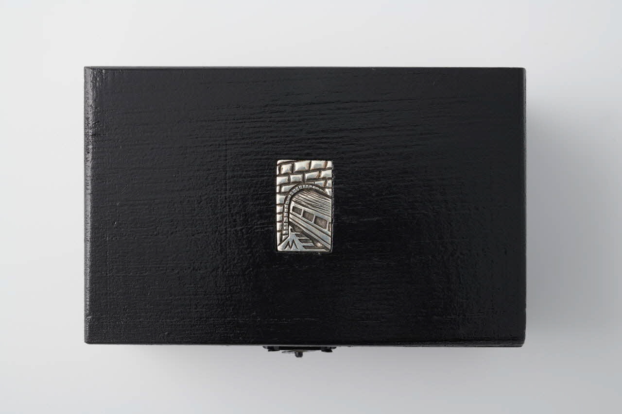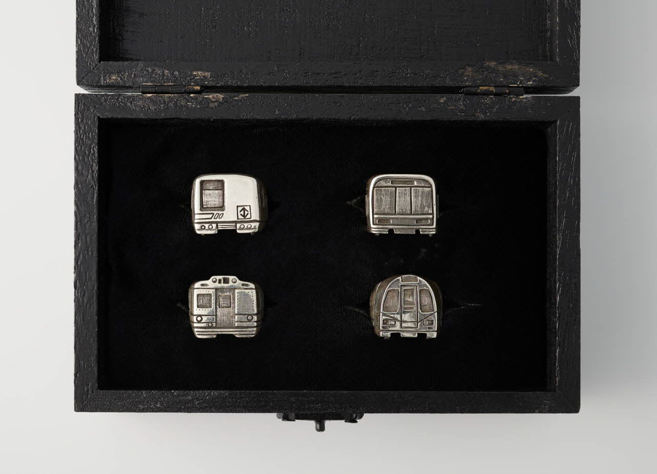 Un écrin a été confectionné par Mind pour les 4 bagues destinées au Mucem. C'est un prototype réalisé de façon artisanale avec une éponge recouverte de feutrine et fendue, placée dans un coffret peint et vernis. La couleur noire allie l'élégance et la sobriété. La plaque d'argent apposée sur le couvercle, montrant un métro sortant d'un tunnel, annonce la thématique des bagues contenues dans le coffret.Inscriptions