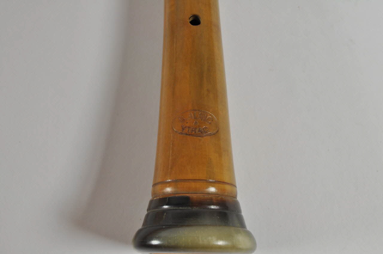 Ce tuyau mélodique de cabrette est en buis avec des viroles en corne brune à chaque extrémité. L'une fait office de pavillon. Le tuyau est percé de 8 trous de jeu (l'avant-premier en bas est décallé à droite) . A l'arrière, deux trous d'accord sont percés, l'un en haut, l'autre en bas. Une ligne est gravée en bas.Décor