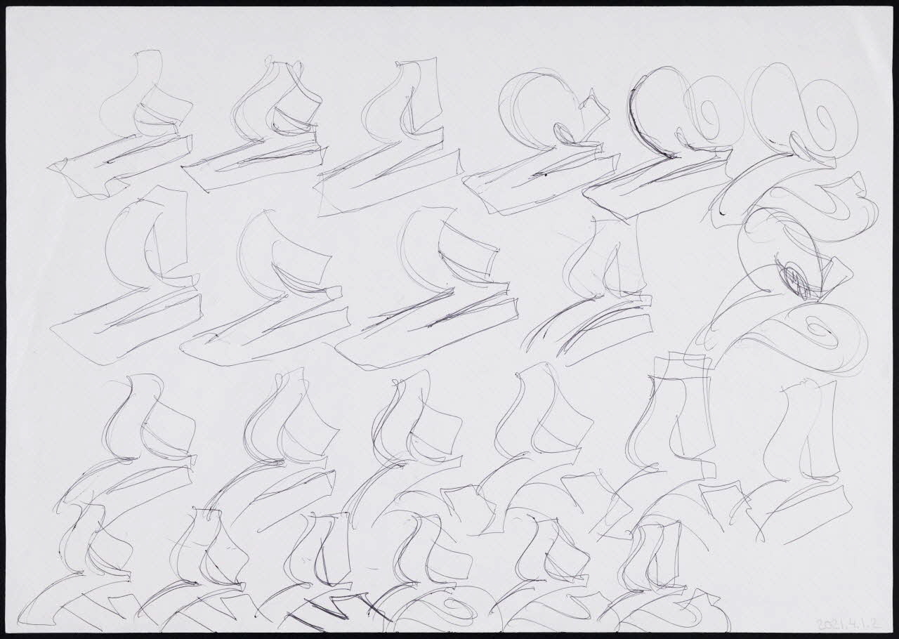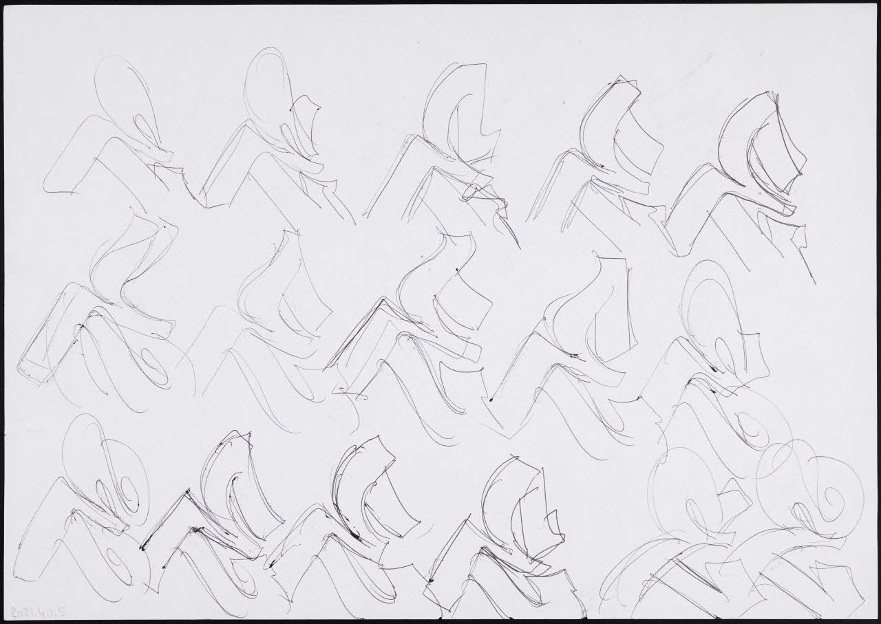 Ensemble dissociable de 6 feuilles de papier blanc de format A4, sur lesquelles Neuro effectue des recherches calligraphiques sur la lettre E au stylo bille. Ses recherches ont pour but de créer des effets dynamiques à partir d'un canon stylistique "straight letters".Matériaux et techniques