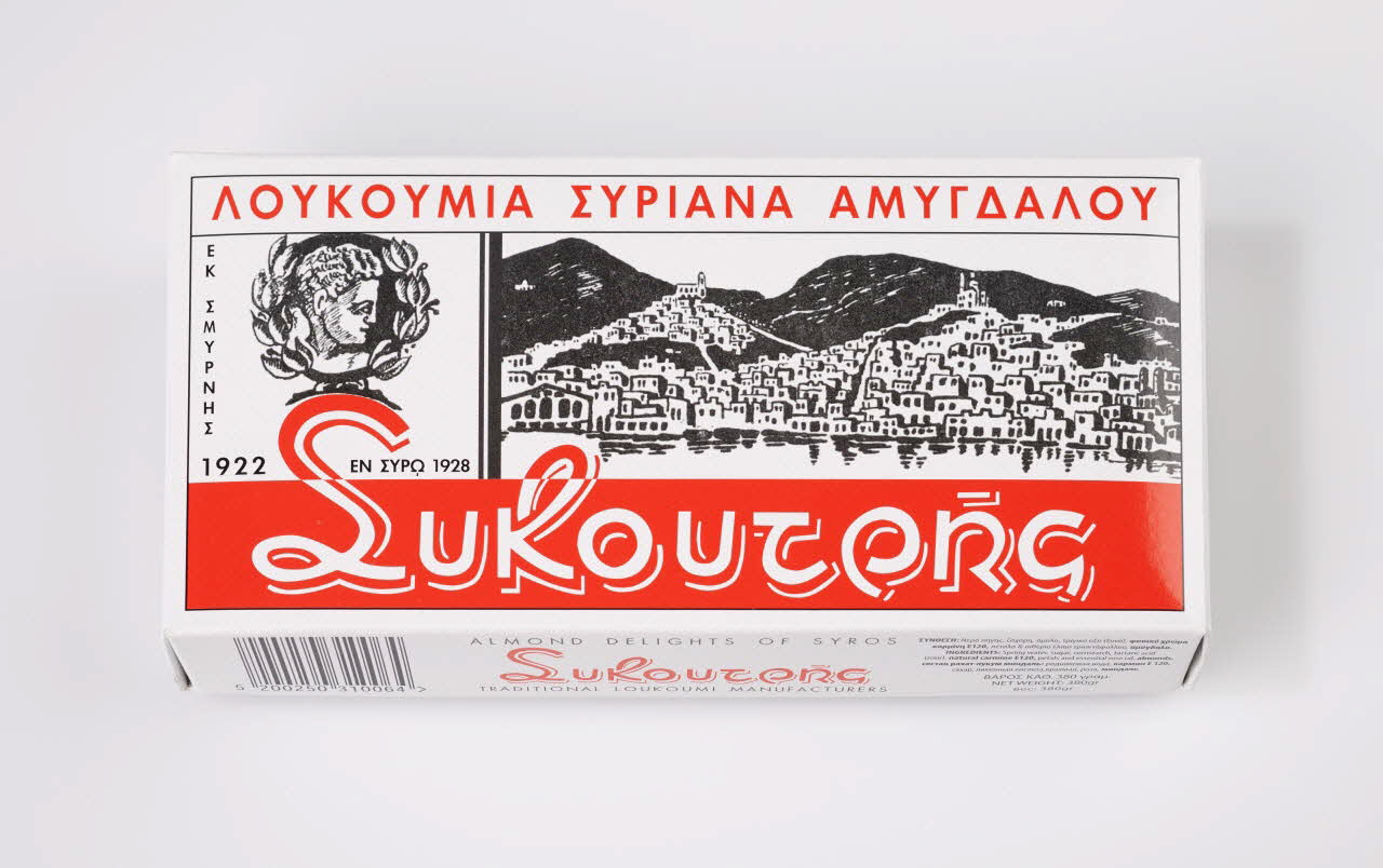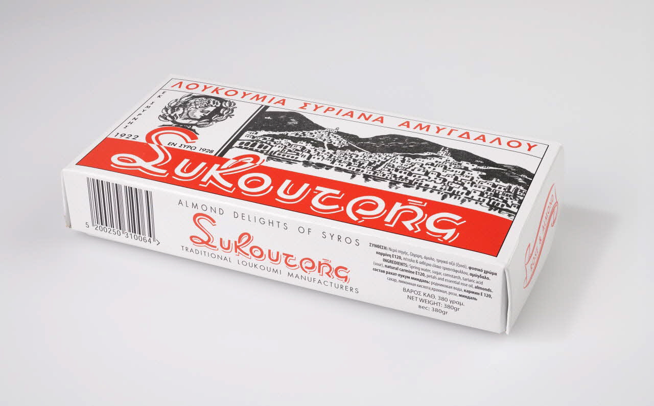 Le dessus du couvercle (.2) : en haut un registre avec inscription en rouge LOUKOUMIA SYRIANA AMYGDALOU, registre central à gauche : portrait à l'antique avec les dates de 1922 et 1928, à droite représentation panoramique de la ville de Syros, en dessous sur fond rouge SYKOUTRIS ( nom de la fabrique). Grands cotés, en rouge, nom SYKOUTRIS avec coordonnées, ingrédients et code barre. Petit coté 1 :dans un phylactère PODOZAKARI Petit coté 2 : dans un phylactère ROSE AND ALMONDDécor