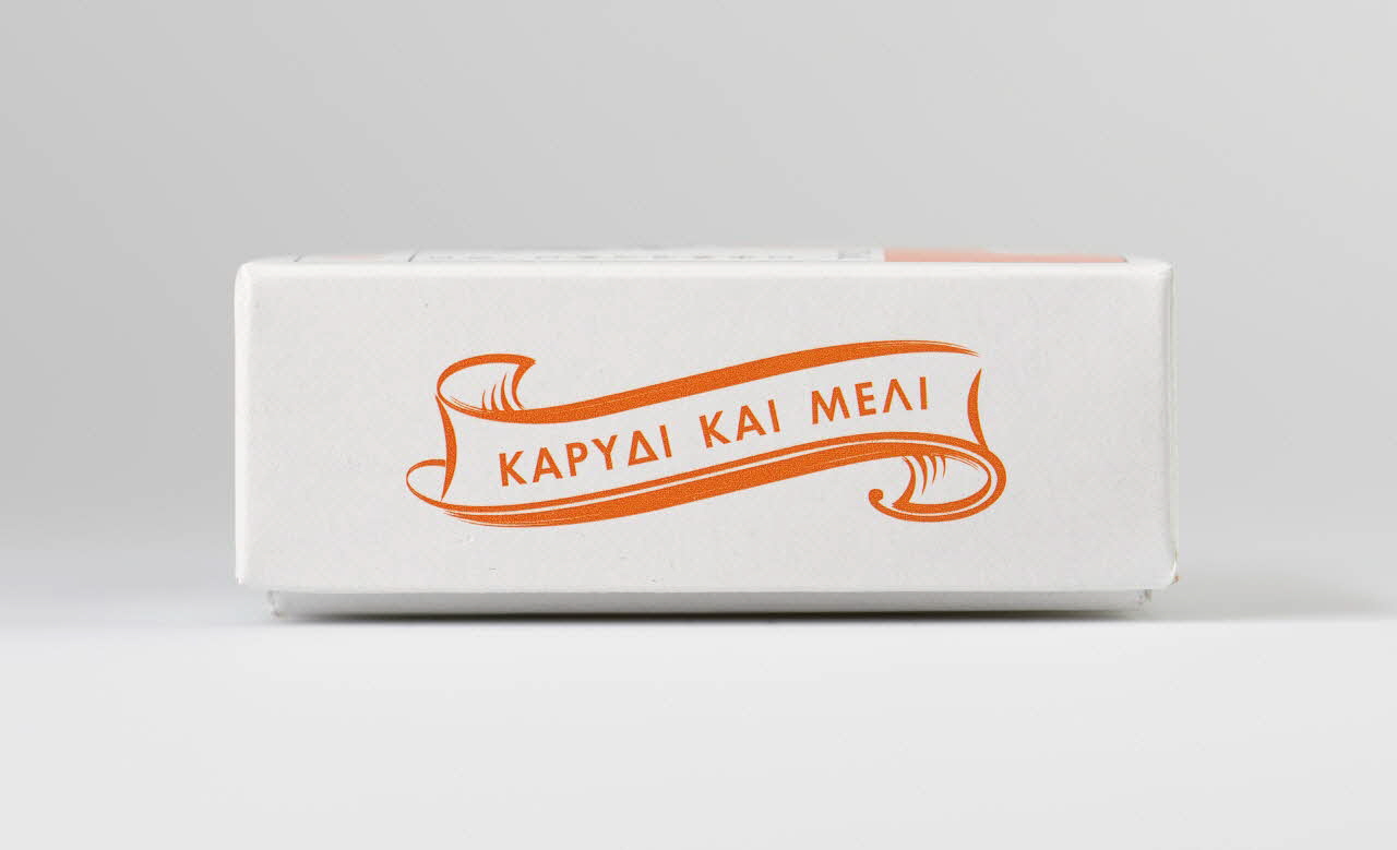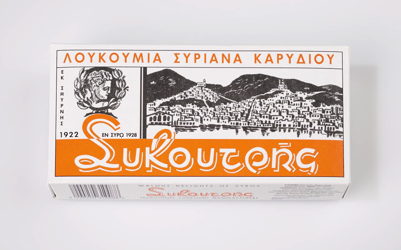 Le dessus du couvercle (.2) : en haut un registre avec inscription en orange LOUKOUMIA SYRIANA KARIDIOU, registre central à gauche : portrait à l'antique avec les dates de 1922 et 1928, à droite représentation panoramique de la ville de Syros, en dessous sur fond orange SYKOUTRIS ( nom de la fabrique). Grands cotés, en orange, nom SYKOUTRIS avec coordonées, ingrédients et code barre. Petit coté 1 : dans un phylactère KARIDI KAI MELI Petit coté 2 : dans un phylactère WALNUT & HONEYDécor