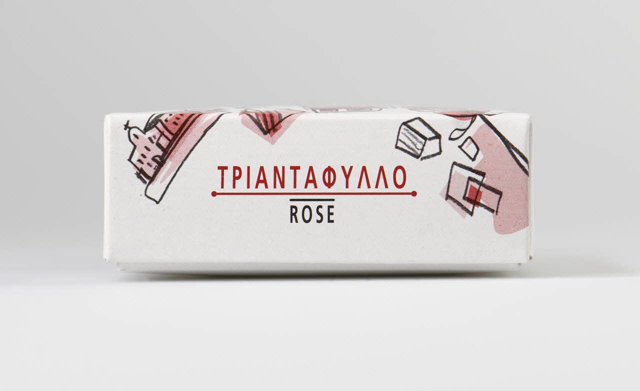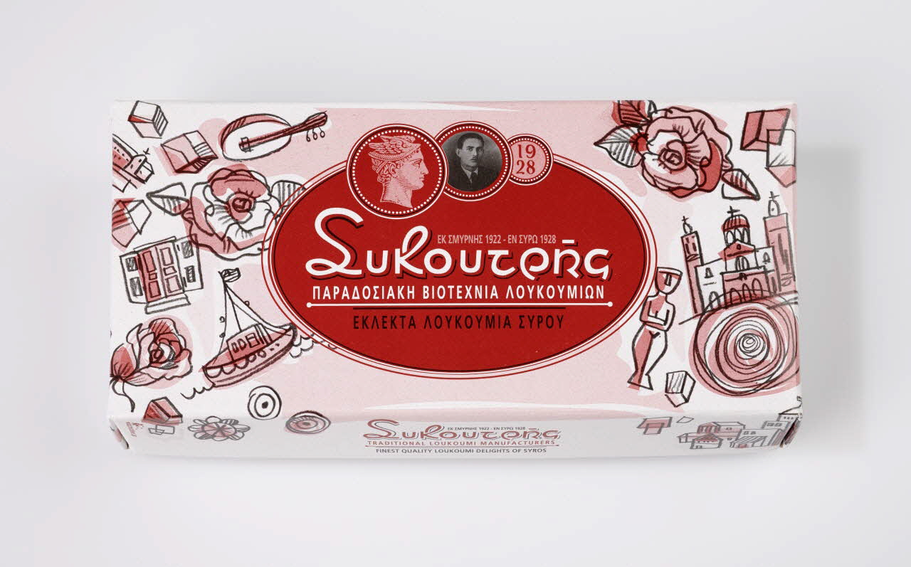 Le dessus du couvercle (.2) : sur un fond de motif typiquement grec : bateaux, instruments de musique, statues cycladiques, églises orthodoxes, fleurs... se détachent plusieurs médaillons dont un central ovale avec inscription SIKOUTIS / PARADOSIAKI BIOTECHNIA LOUKOUMION, au dessus médaillon avec Hermès à l'antique de profil puis photo du grand père Sikoutris et à droite un dernier médaillon avec 1828 de marqué. Grand coté 1 : en rouge SYKOUTIS TRADITIONAL LOUKOUMI MANUFACTURERS Grand coté 2 : coordonnées, ingrédients et code barre Petits cotés : TRIANTA PHILLO ROSEDécor
