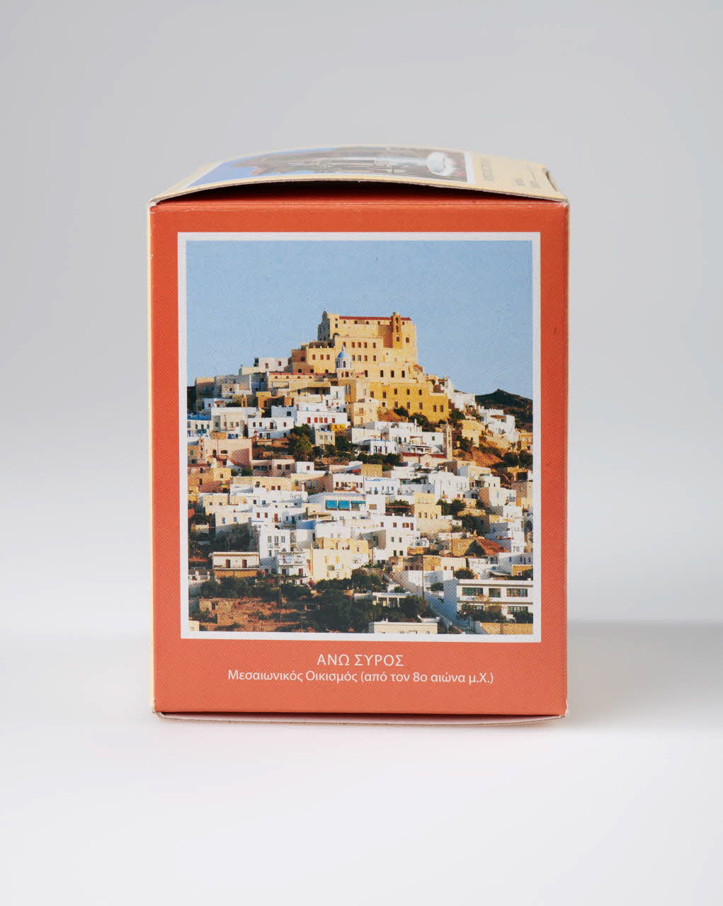 Sur fond jaune et orange photographies de paysages et de momunements de l'île de Syros.Inscriptions
