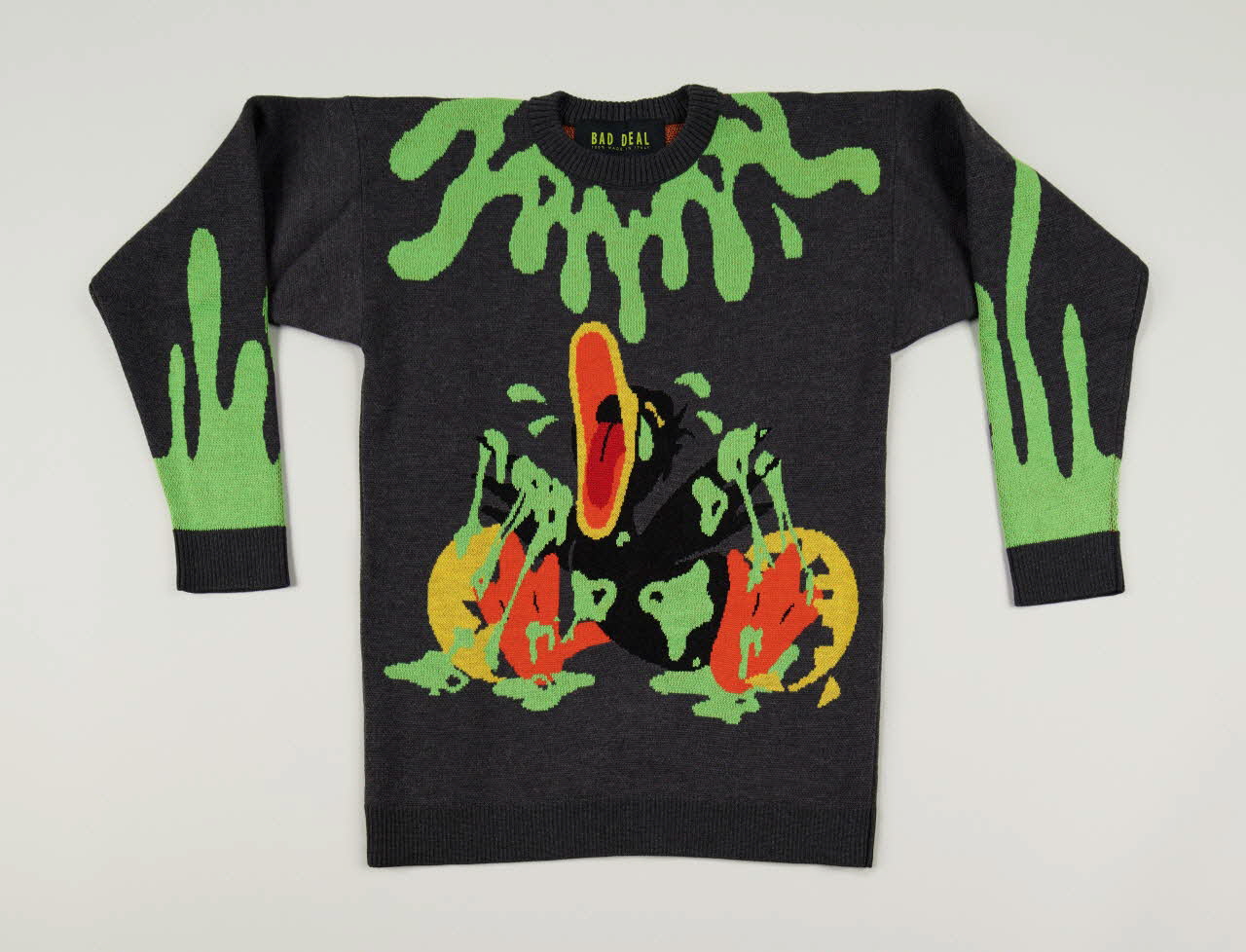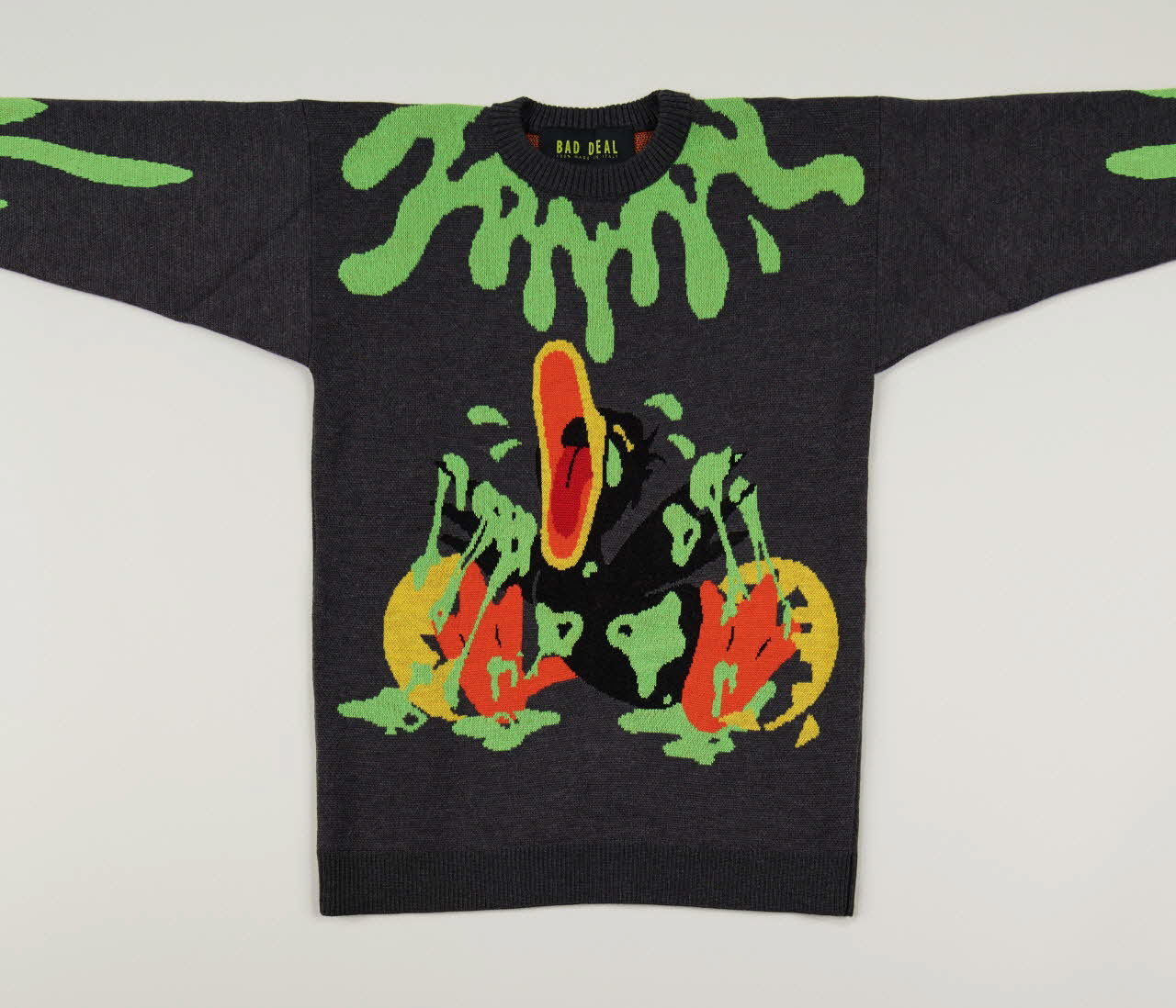 Ce pull-over en jacquard est orné sur le devant d'un vilain petit canard en pleurs couvert de peinture. Ce dernier représente le writer milanais Erpes, dont la mère a contrarié la vocation de taggueur lorsqu’il était jeune adolescent. Une nuit, ayant découvert la cachette où il conservait tous ses marqueurs, ses parents ont entièrement tagué sa chambre et ses vêtements, afin de lui faire comprendre la nuisance qu’il infligeait à autrui. Fou furieux, Erpes s’est mis à taguer et graffer d’autant plus, et est devenu un King à Milan. Le vilain petit canard représente Erpes au moment de son réveil, horrifié et furieux de découvrir sa chambre dévastée. Le pull-over est accompagné d'une étiquette en carton "Bad deal 100% made in Italy", fixée à son étiquette textile par un cordon et une épingle à nourrice (2020.22.51.2.2).Décor