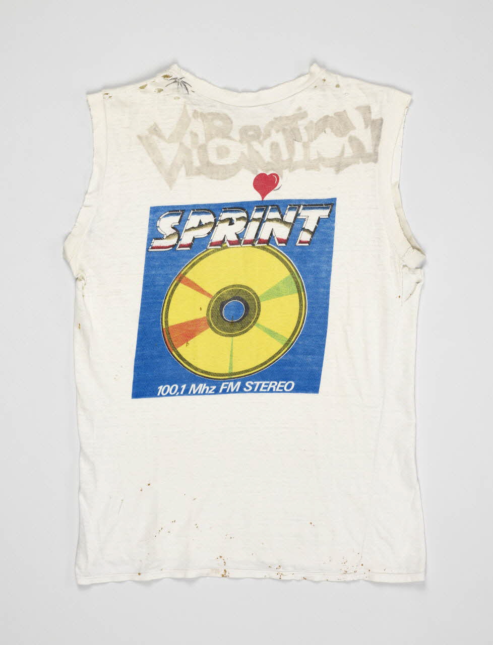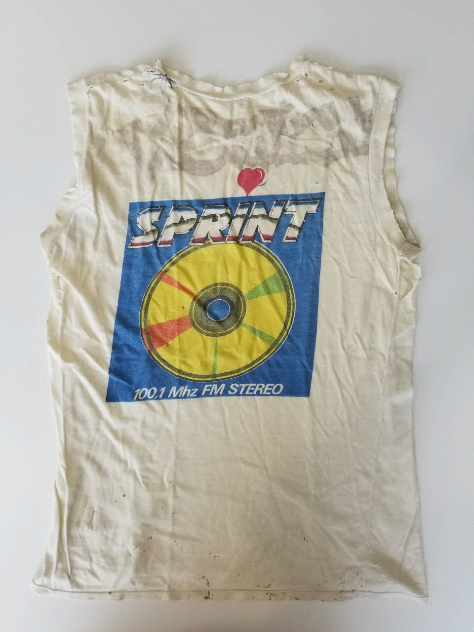 SPRINT 100,1 Mhz FM STEREO (Nom de la radio à l'arrière du tee-shirt), derrièreInscription manuscrite
