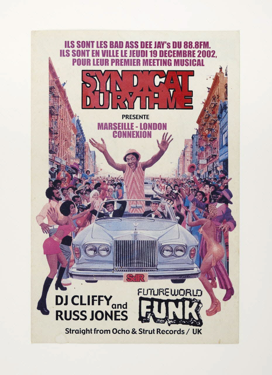Au recto : - Le flyer précise l'événement : une soirée donnée le 22 décembre 2002 au Café Julien, à Marseille. - Sont aussi listés les DJs et MC invités, dont DJ Cliffy et Russ Jones, de Londres. - Les soutiens de l'événement sont indiqués : le Syndicat du Rythme, Radio Grenouille, le collectif Futureworld Funk, l'espace Julien et le café Julien, à Marseille. - L'image montre un artiste conduit dans un cabriolet décapotable par un chauffeur, et acclamé par une foule de fans. Le modèle de la Rolls Royce et les tenues vestimentaires évoquent le style funk, de la fin des années 1960 et 1970. Au verso : - la même image est developpée. - la dimension internationale de la soirée est soulignée par la mention "Marseille - London Connexion". Il annonce un événement organisé par le Syndicat du Rythme, un collectif créé par Rebel avec DJ C.Real, DJ Cab et Le Bijoutier en hommage au Rhythm Syndicate créé par IceT à Los Angeles. DJ Rebel avait en effet reçu la visite des trois autres DJ alors qu'il travaillait à Radio Grenouille. Comme ils écoutaient du reggae et du hip-hop, Rebel leur a proposé la création du collectif. C'était au début des années 2000. Ils ont commencé à organiser des soirées - devenues mythiques en deux ou trois ans - au Cabaret aléatoire, à Marseille. Tous étaient passionnés de James Brown, qui a été beaucoup samplé par les DJ hip-hop. Comme ces soirées marchaient bien, ils invitaient des artistes internationaux.Décor