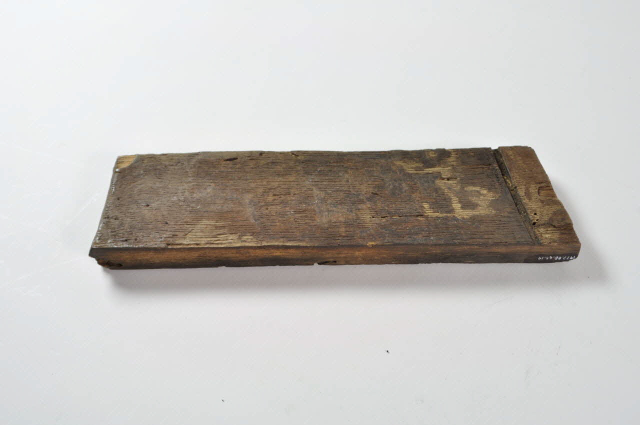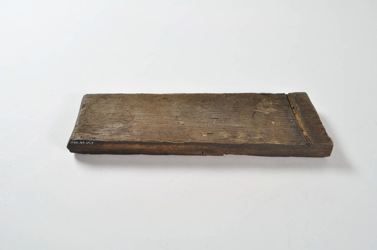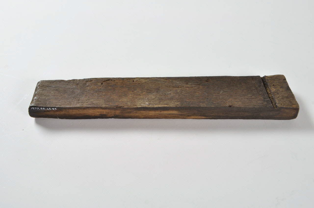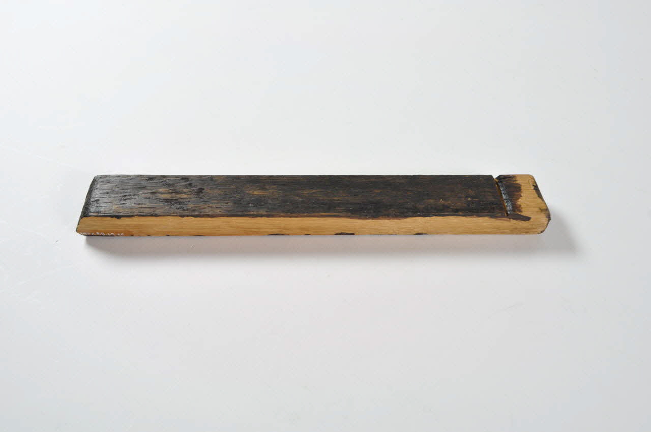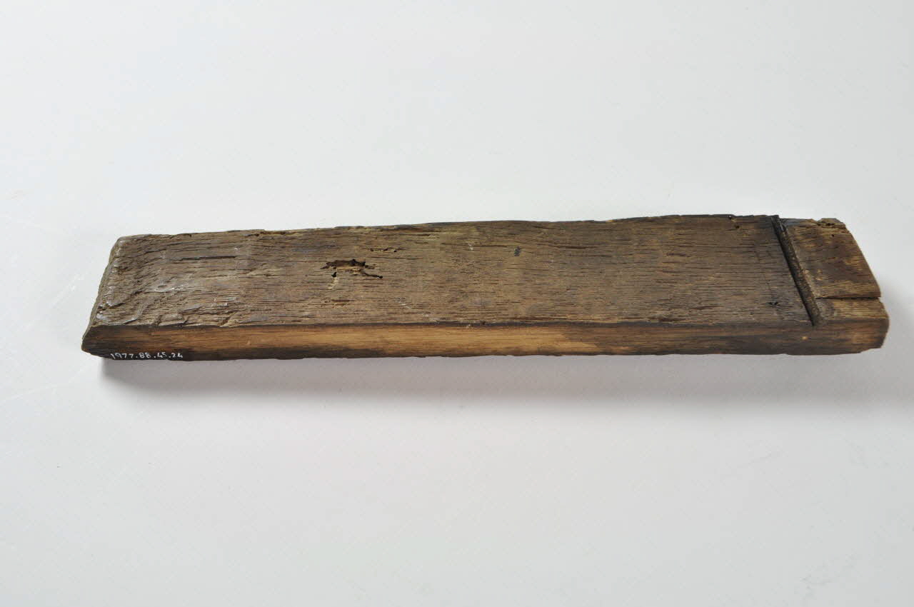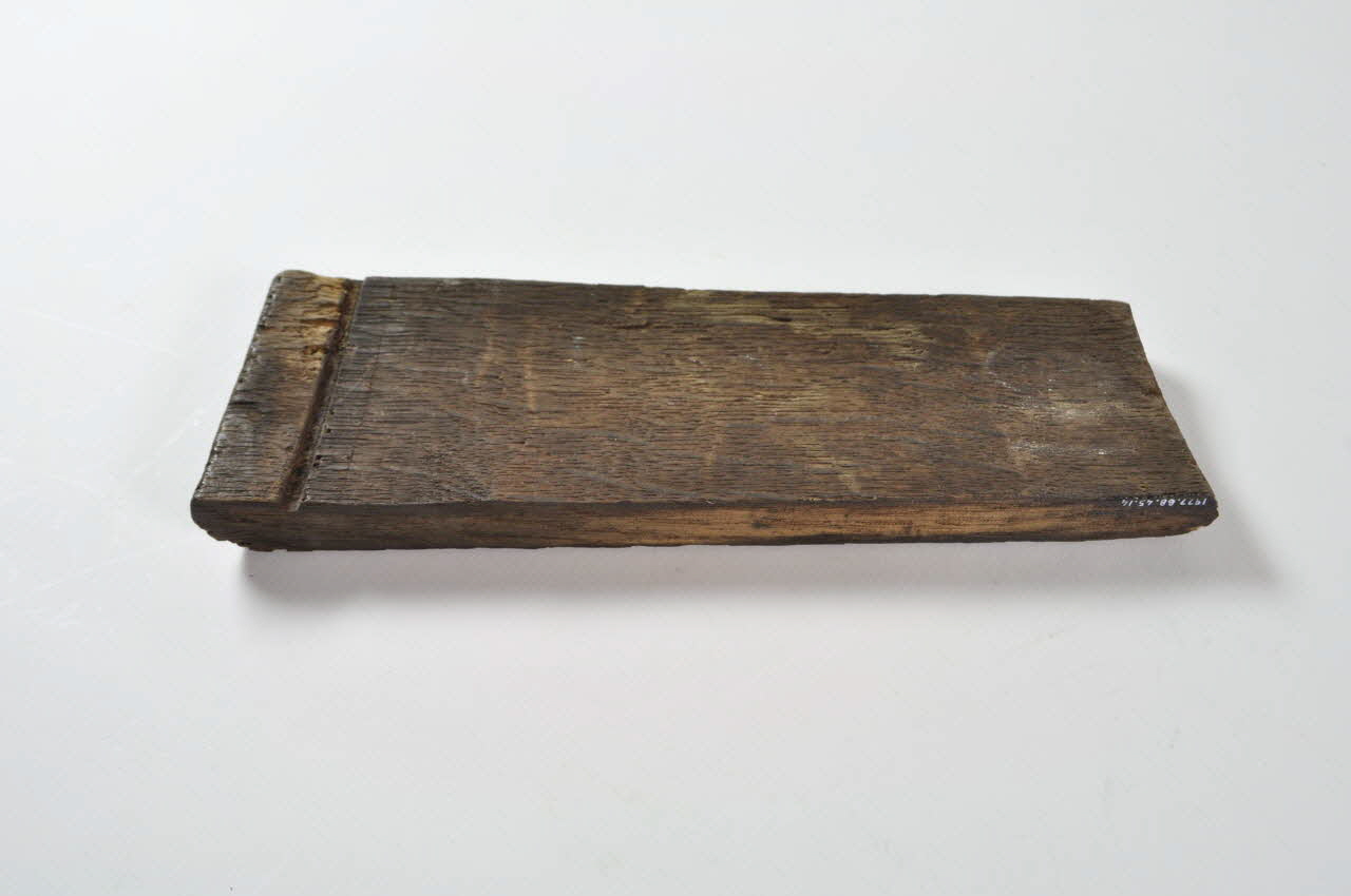 Entonnoir désassemblé en forme de baquet circulaire. Il se compose d'un fond en bois avec tube, de vingt-six douelles rectangulaires en bois et de trois cercles de maintien en fer.Matériaux et techniques
