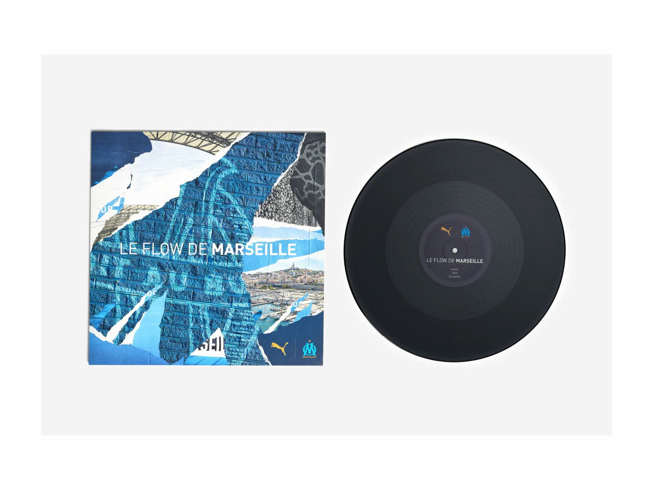 Le vinyle présente en son centre des inscriptions : le titre "Le flow de Marseille" et le nom des rappeurs. Il est accompagné du logo de Puma et du club olympien.Décor