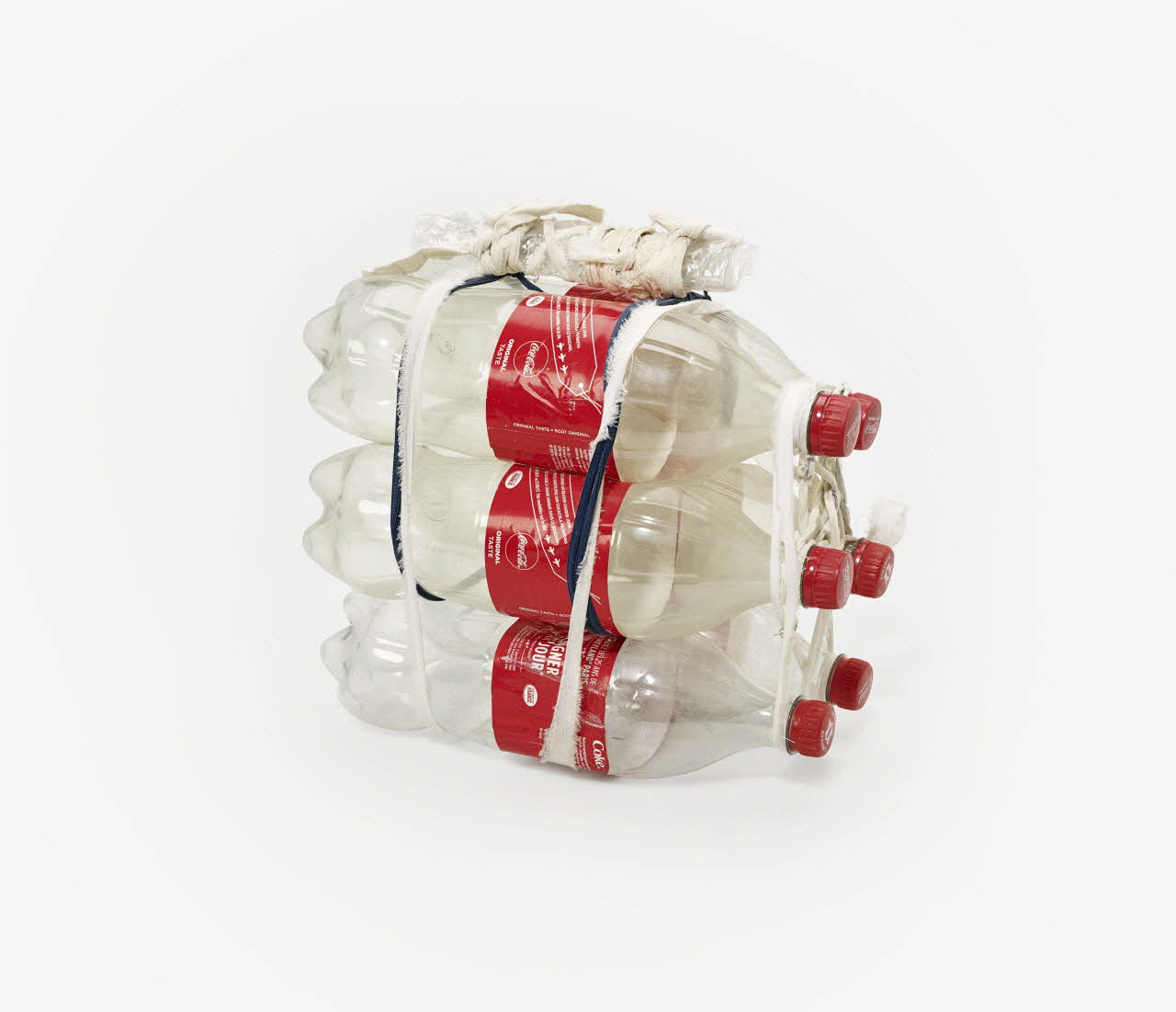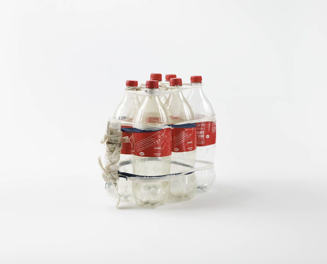 Six bouteilles en plastique de Coca Cola attachées entre elles avec des morceaux de draps et deux lacets pour former une haltère. La poignée est constituée d'une bouteille écrasée sur laquelle ont été noués plusieurs morceaux de draps.Matériaux et techniques