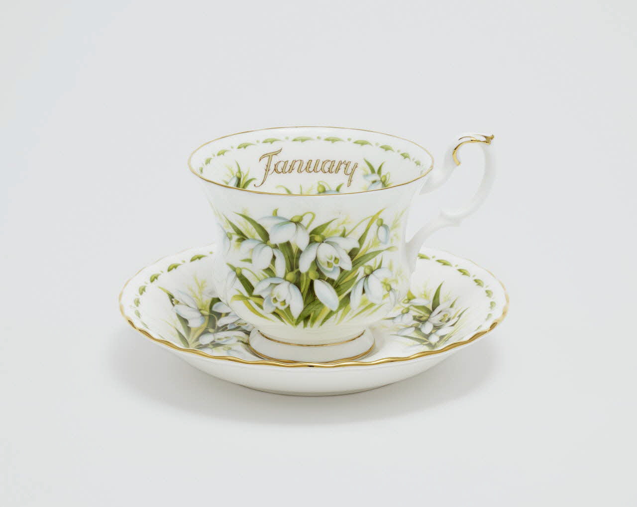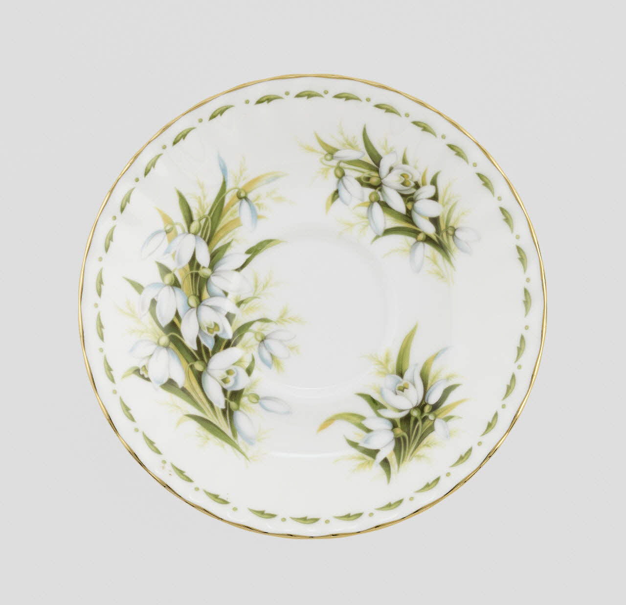 Royal Albert/ Bone China/ England/ Flower of the month series/ snowdrops/ c 1970 Royal Albert LTD (tasse), au dessousRoyal Albert/ Bone China/ England/ Flower of the month series/ snowdrops/ c 1970 Royal Albert LTD (soucoupe), au dessousDécor