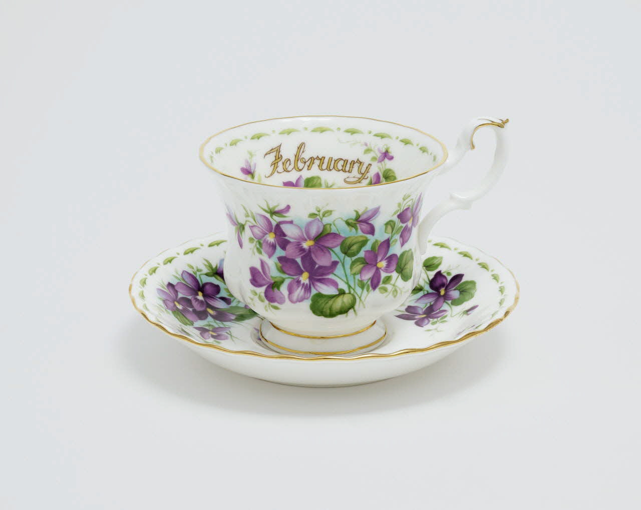 La tasse présente sur sa face avant et arrière un décor central composé de violettes. Des dorures accompagnent ce décor floral : un trait continu orne le pourtour du bord supérieur, un double trait continu orne la base de la tasse, l'anse possède un motif végétal stylisé et un trait épais. L'intérieur de la tasse présente sur la partie supérieure une frise alternant une feuille et un point vert. Le mois de l'année est inscrit sous cette frise et est encadré de motifs de violettes.