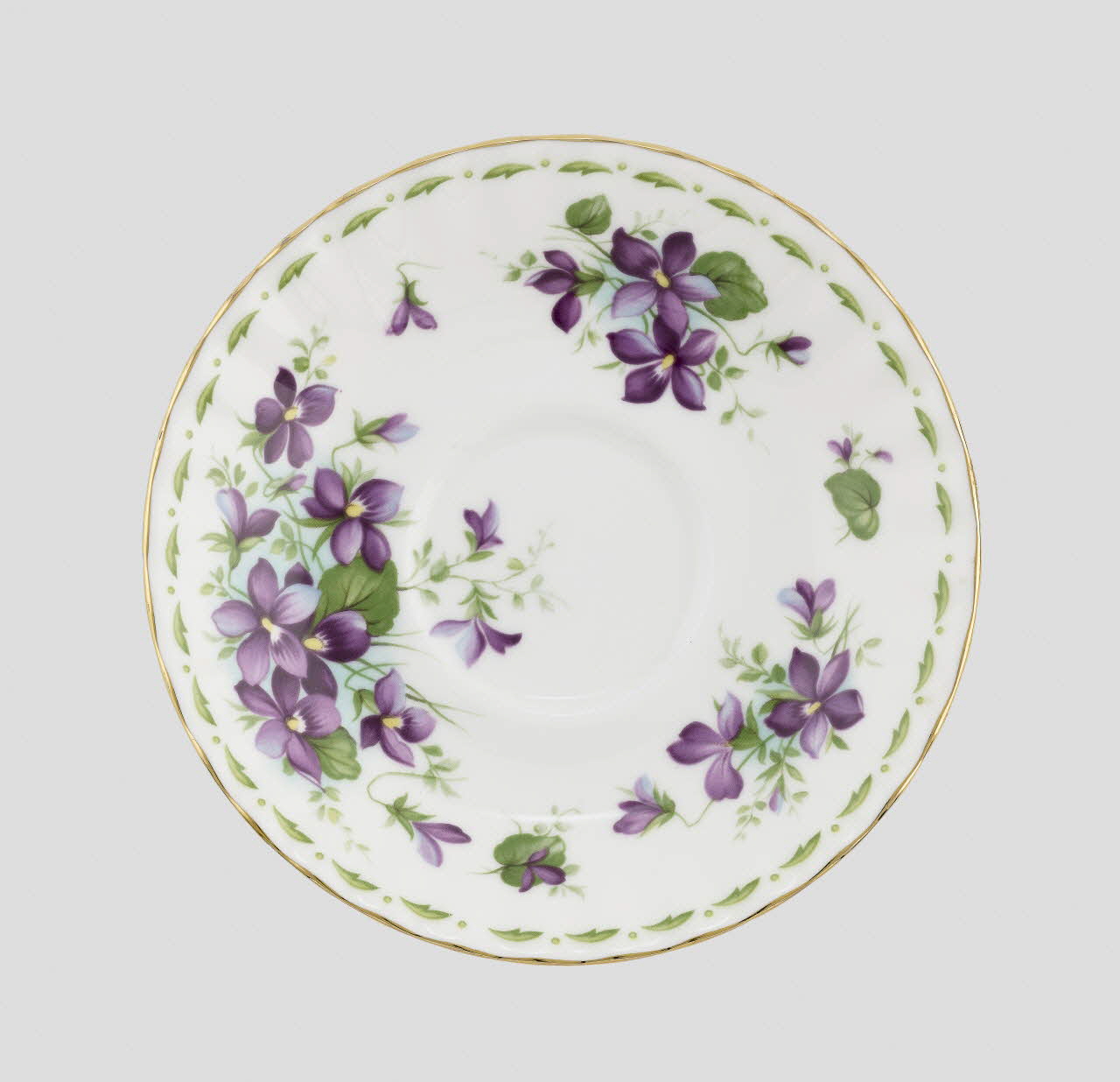 La soucoupe est ornée d'un décor similaire. Sur le pourtour on observe une frise végétale puis trois bouquets de violettes encadrent le renfoncement central de la soucoupe. Les bords sont dorés d'un trait continu.Inscriptions
